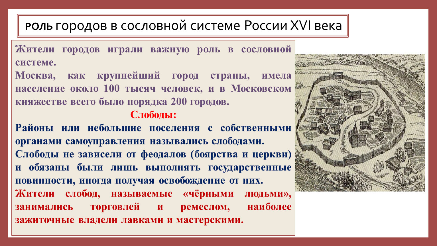 Слободы не зависели от феодалов (боярства и церкви) и обязаны были лишь выполнять государственные повинности, иногда получая освобождение от них.