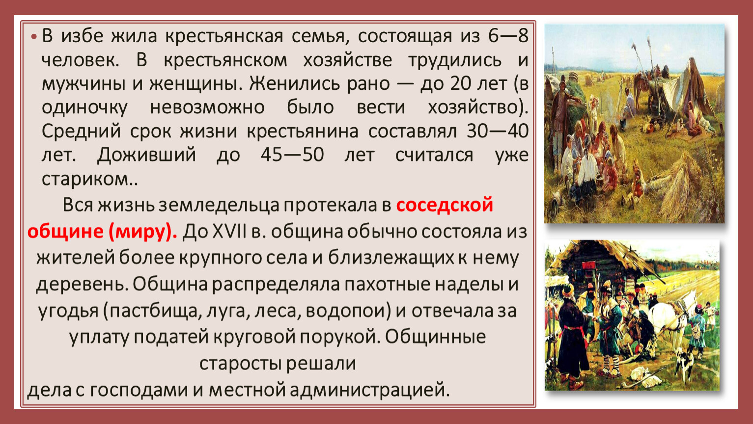 Вся жизнь земледельца протекала в соседской общине (миру). До XVII в. община обычно состояла из жителей более крупного села и близлежащих к нему деревень. Община распределяла пахотные наделы и угодья (пастбища, луга, леса, водопои) и отвечала за уплату податей круговой порукой. Общинные старосты решали