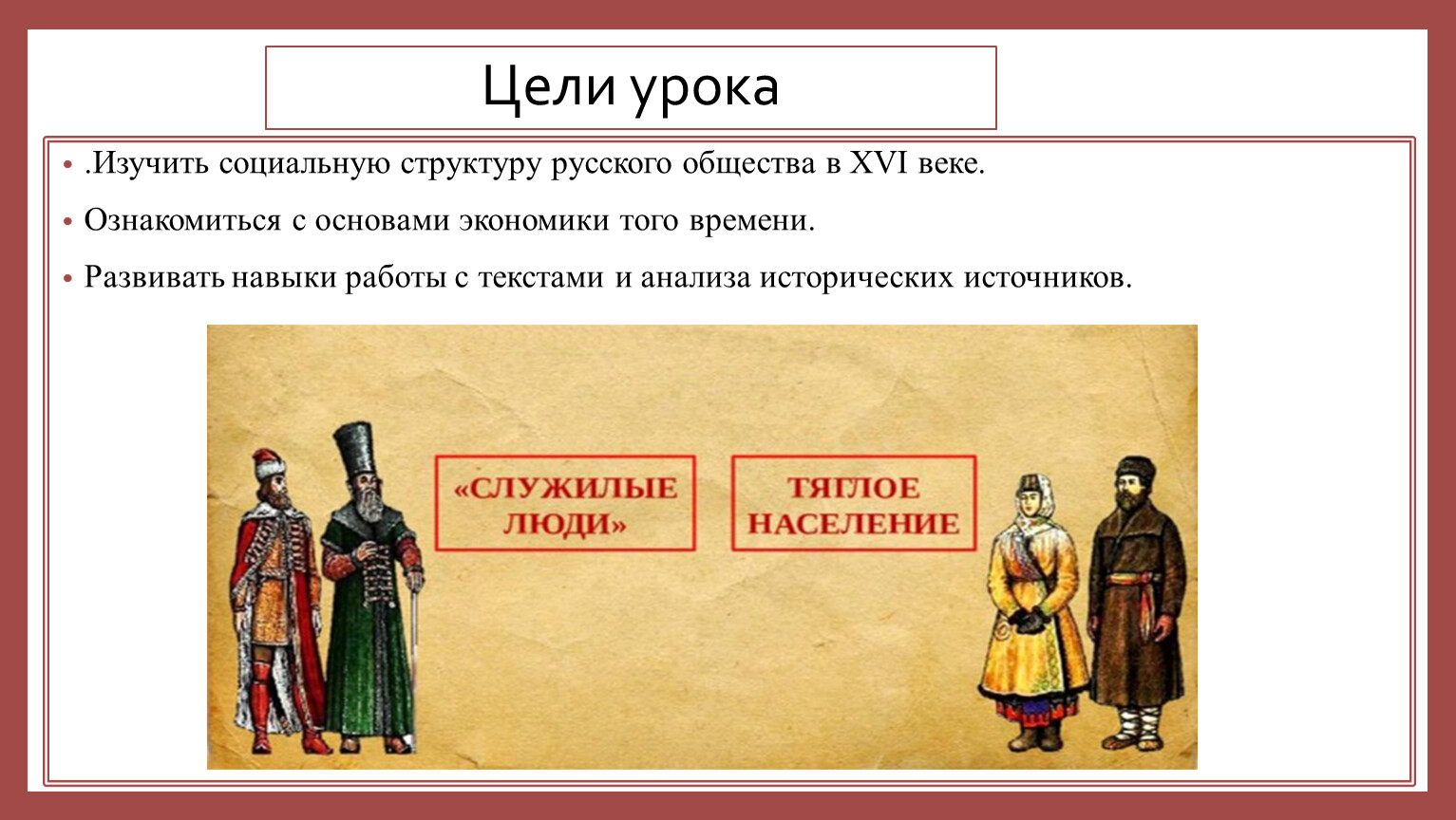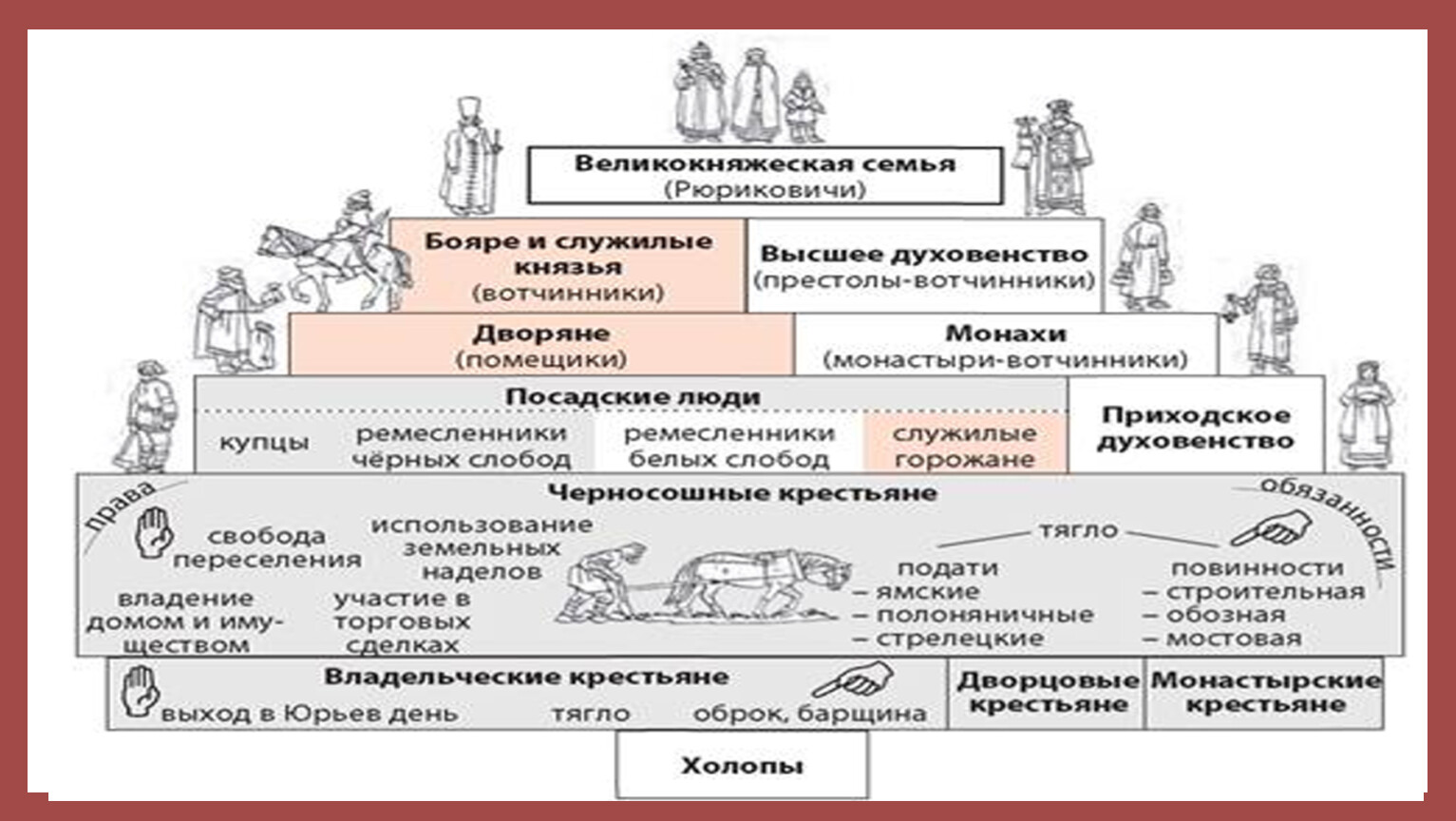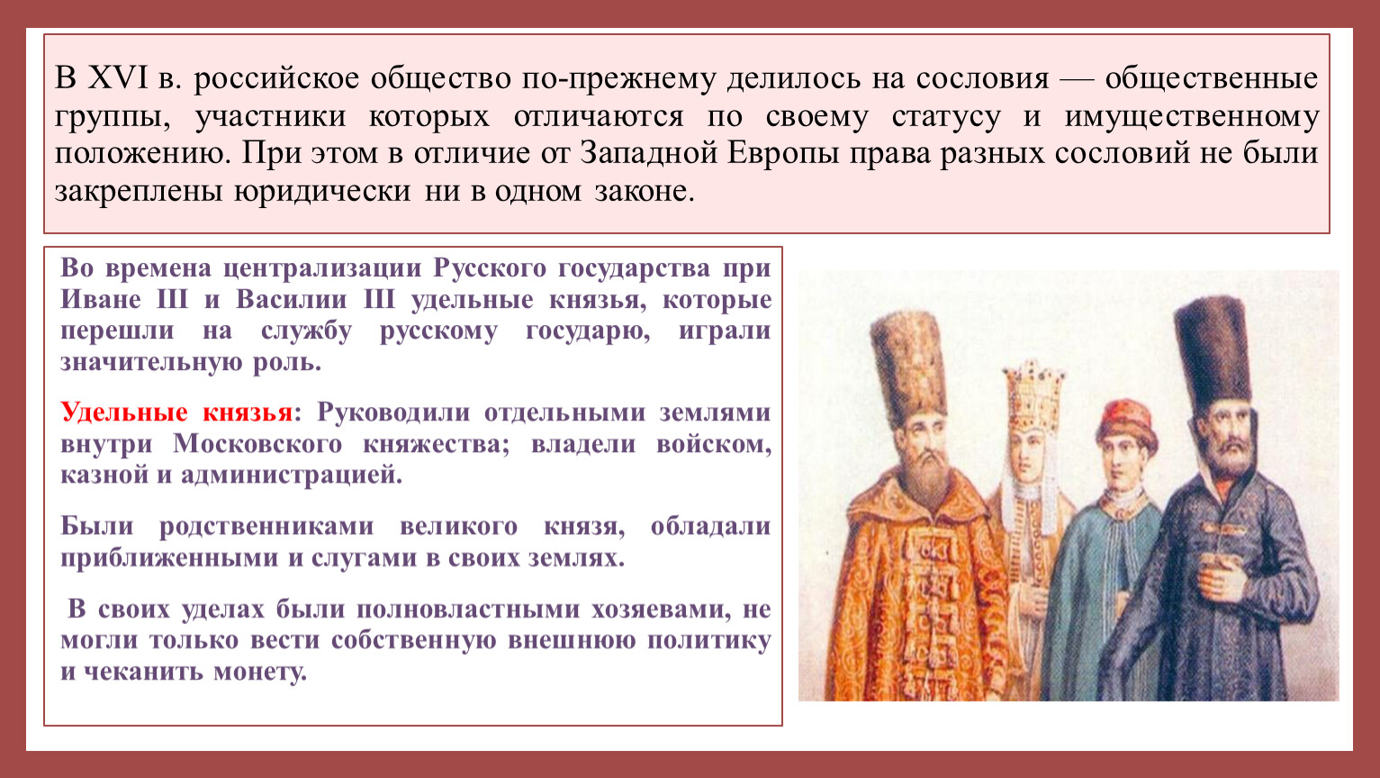 В XVI в. российское общество по-прежнему делилось на сословия — общественные группы, участники которых отличаются по своему статусу и имущественному положению. При этом в отличие от Западной Европы права разных сословий не были закреплены юридически ни в одном законе.