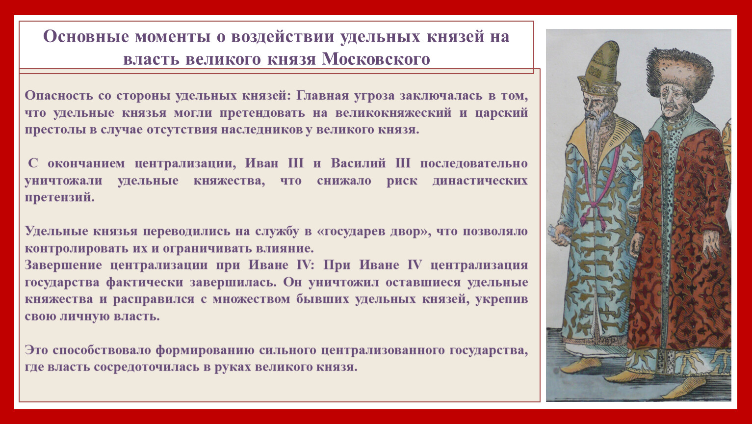 Во времена централизации Русского государства при Иване III и Василии III удельные князья, которые перешли на службу русскому государю, играли значительную роль.