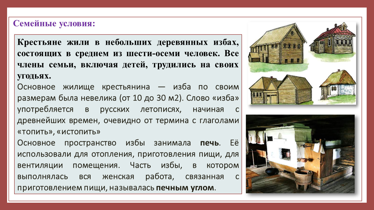 В избе жила крестьянская семья, состоящая из 6—8 человек. В крестьянском хозяйстве трудились и мужчины и женщины. Женились рано — до 20 лет (в одиночку невозможно было вести хозяйство). Средний срок жизни крестьянина составлял 30—40 лет. Доживший до 45—50 лет считался уже стариком..
