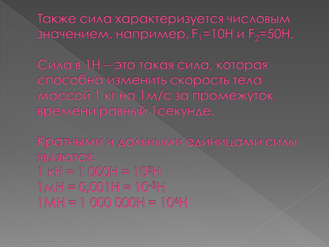 Также сила характеризуется числовым значением, например, F1=10H и F2=50H. Сила в 1Н – это такая сила, которая способна изменить скорость тела массой 1 кг на 1м/с за промежуток времени равный 1секунде.Кратными и дольными единицами силы являются:1 кН = 1 000Н = 103Н1мН = 0,001Н = 10-3Н1МН = 1 000 000Н = 106Н