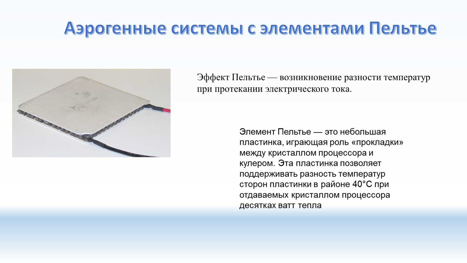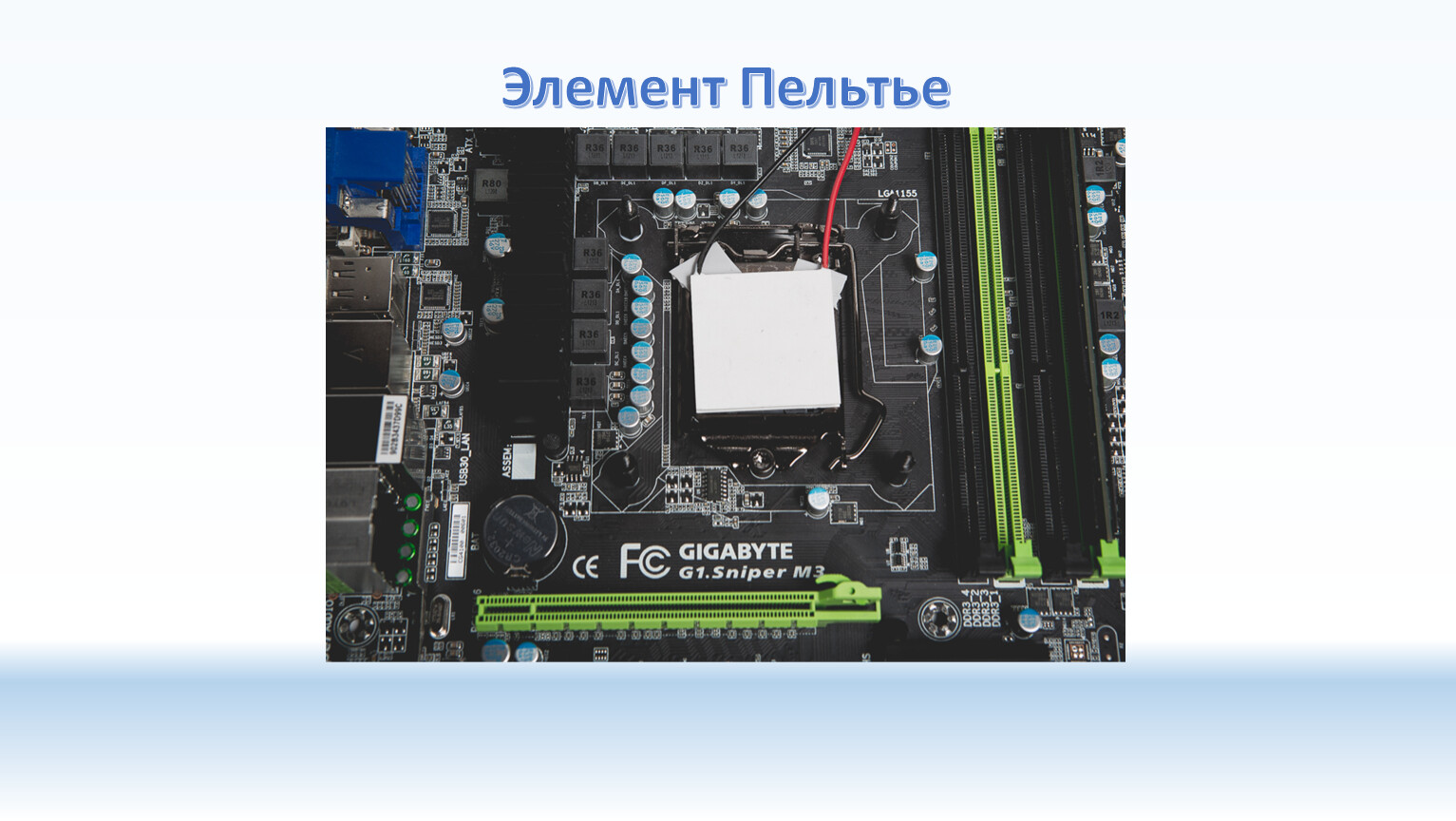 Элемент Пельтье — это небольшая пластинка, играющая роль «прокладки» между кристаллом процессора и кулером. Эта пластинка позволяет поддерживать разность температур сторон пластинки в районе 40°C при отдаваемых кристаллом процессора десятках ватт тепла