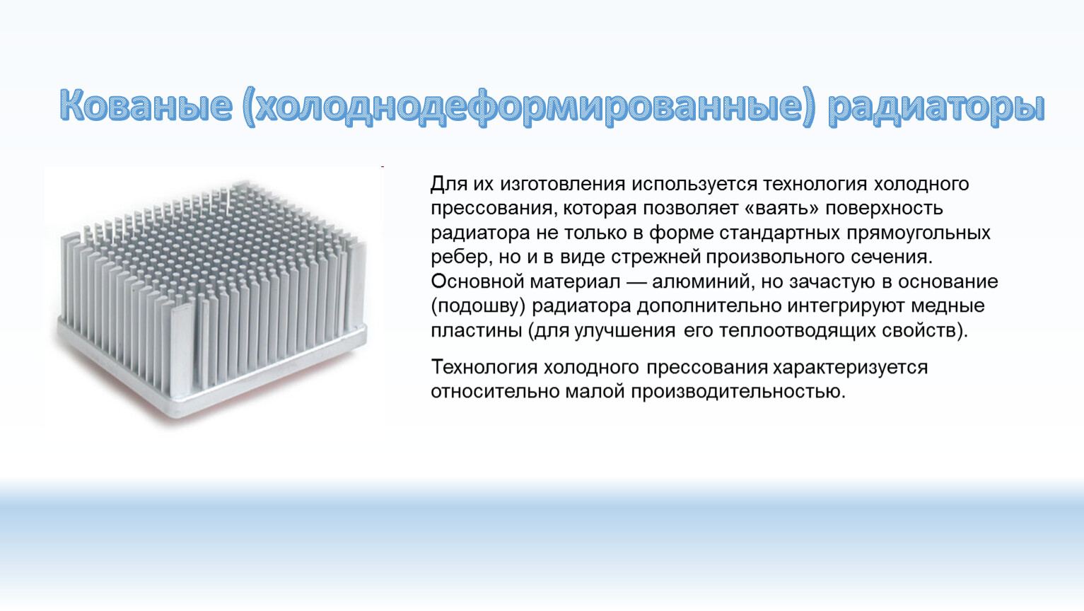 Для их изготовления используется технология холодного прессования, которая позволяет «ваять» поверхность радиатора не только в форме стандартных прямоугольных ребер, но и в виде стрежней произвольного сечения. Основной материал — алюминий, но зачастую в основание (подошву) радиатора дополнительно интегрируют медные пластины (для улучшения его теплоотводящих свойств).