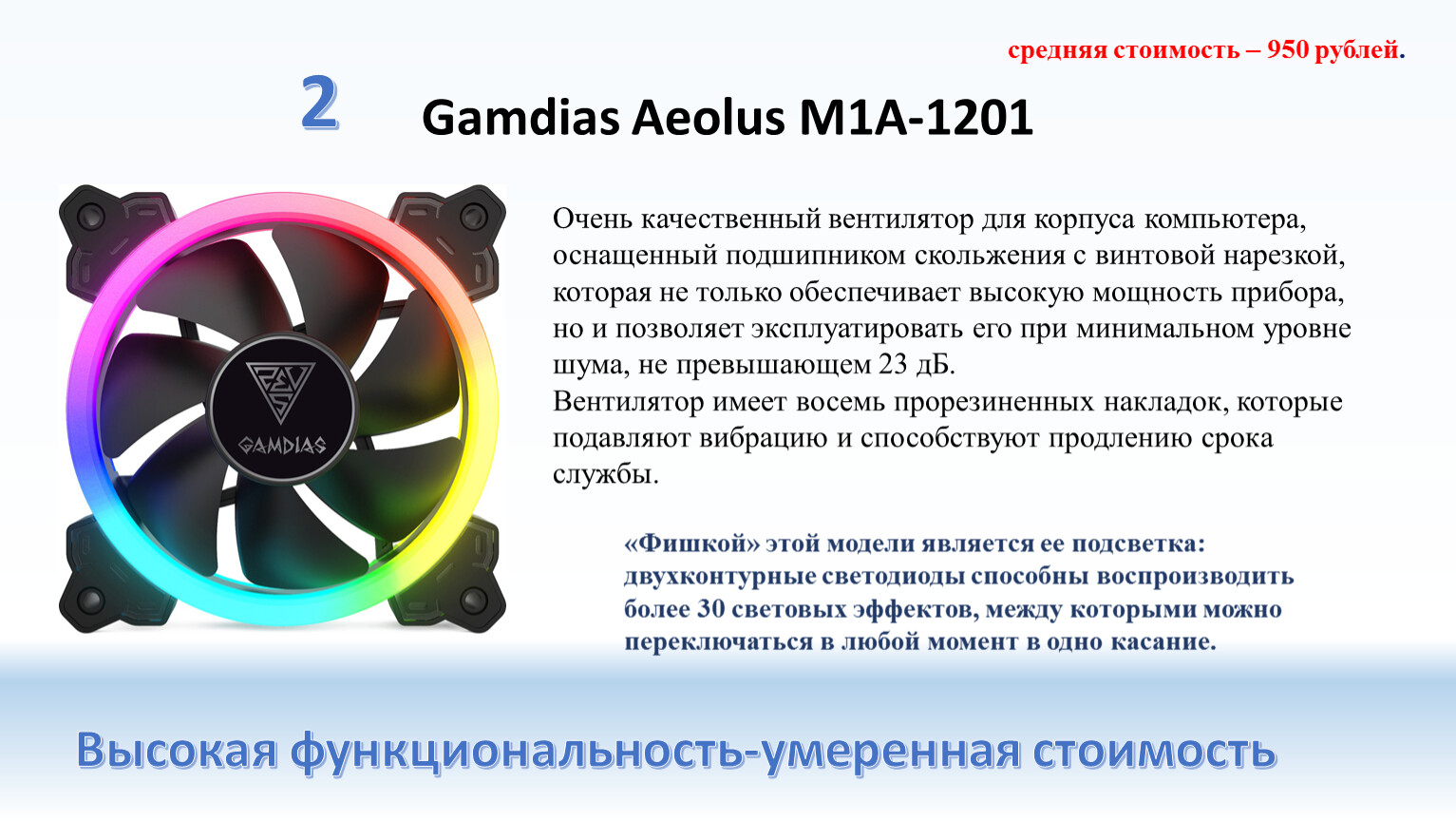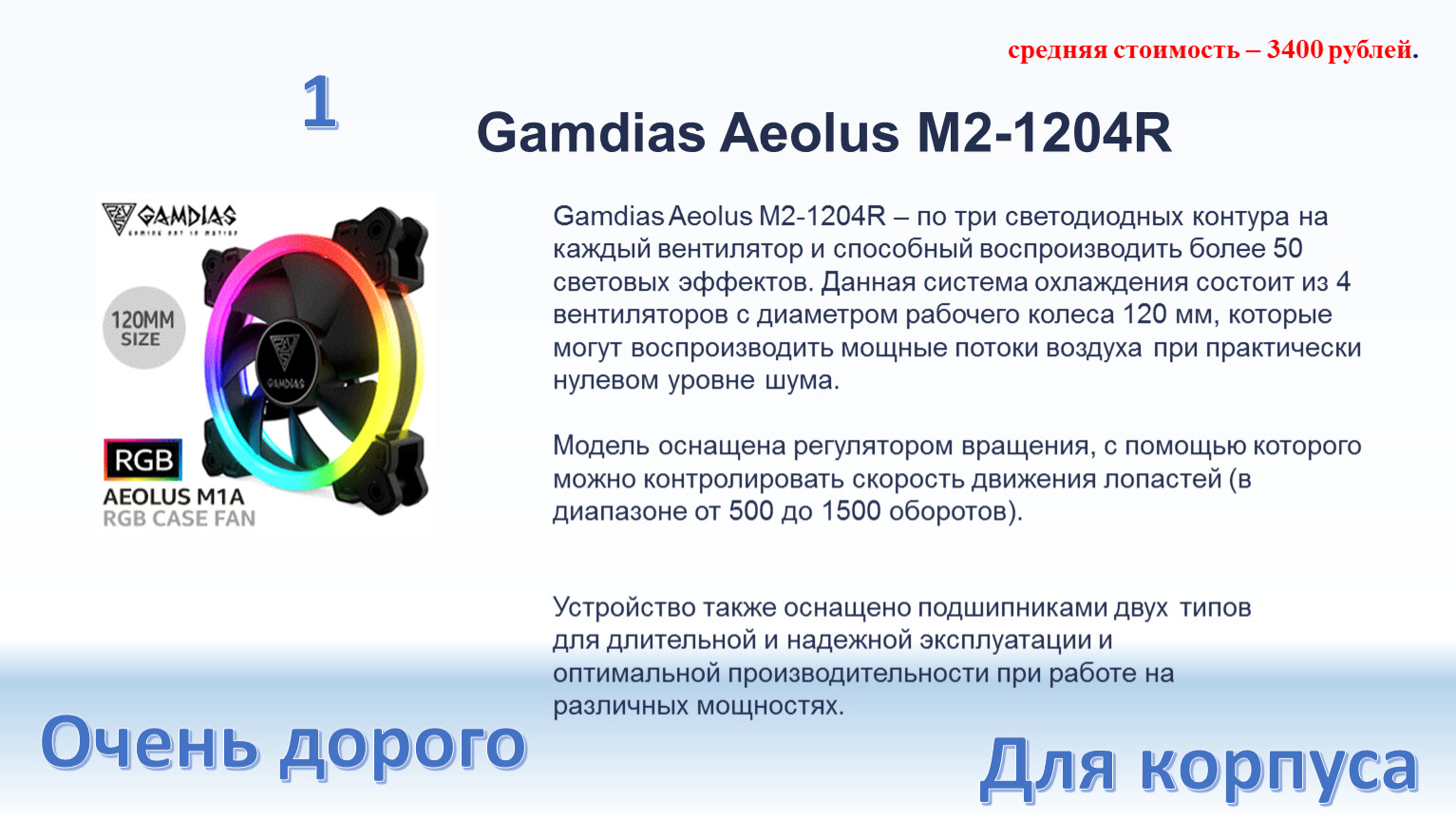 Gamdias Aeolus M2-1204R – по три светодиодных контура на каждый вентилятор и способный воспроизводить более 50 световых эффектов. Данная система охлаждения состоит из 4 вентиляторов с диаметром рабочего колеса 120 мм, которые могут воспроизводить мощные потоки воздуха при практически нулевом уровне шума.