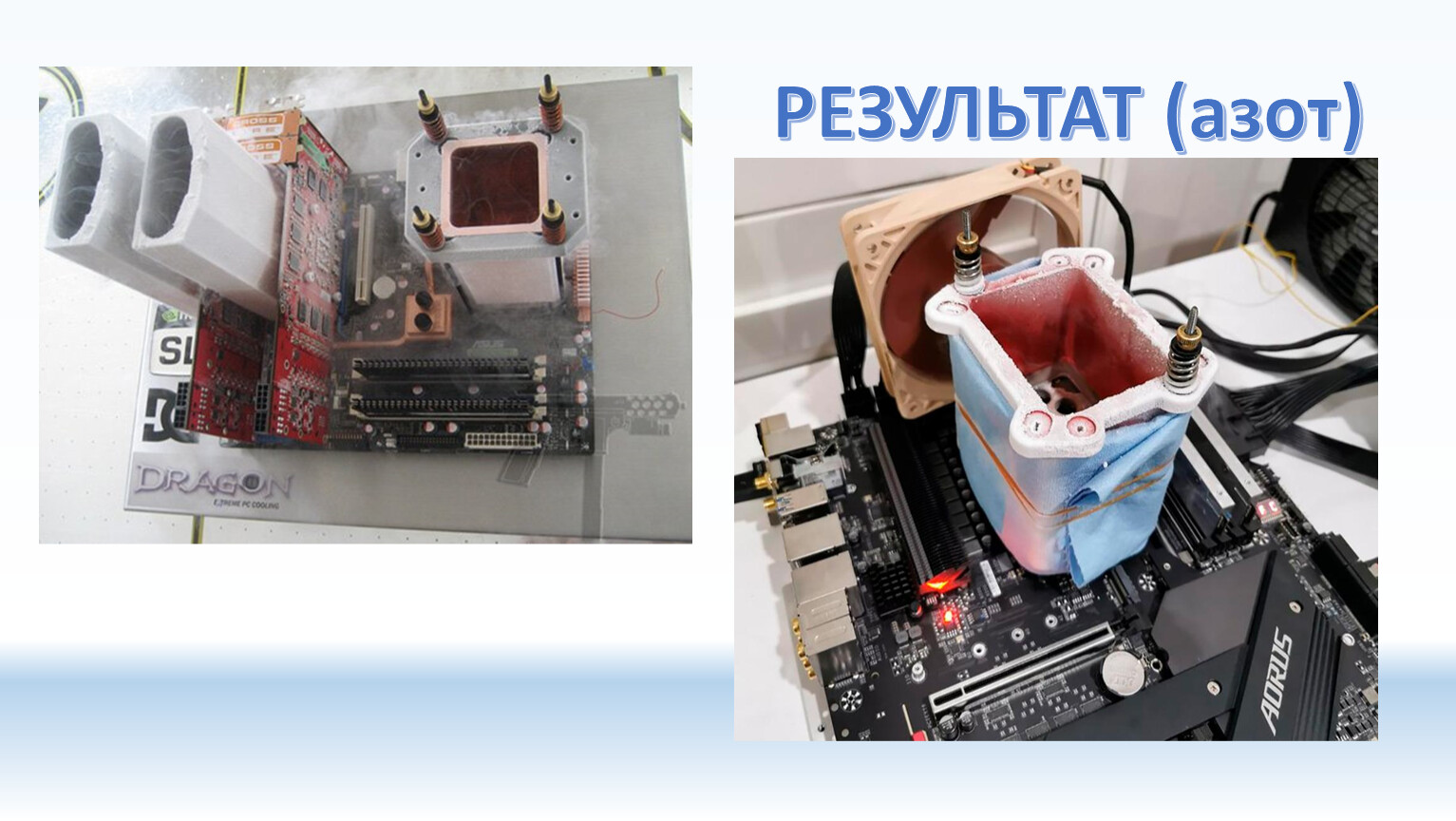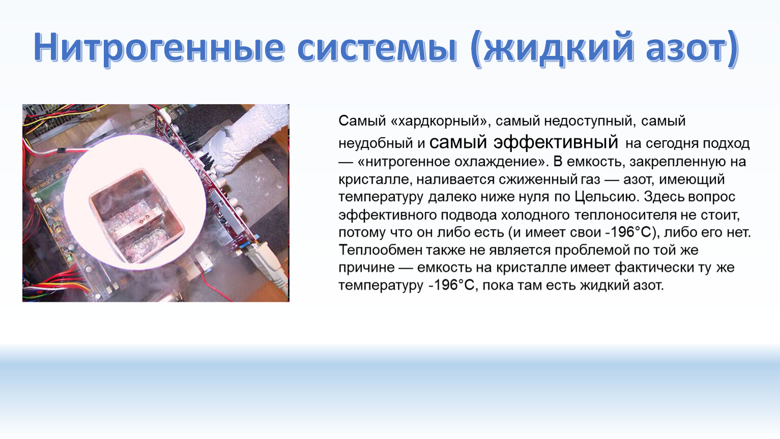 Самый «хардкорный», самый недоступный, самый неудобный и самый эффективный на сегодня подход — «нитрогенное охлаждение». В емкость, закрепленную на кристалле, наливается сжиженный газ — азот, имеющий температуру далеко ниже нуля по Цельсию. Здесь вопрос эффективного подвода холодного теплоносителя не стоит, потому что он либо есть (и имеет свои -196°C), либо его нет. Теплообмен также не является проблемой по той же причине — емкость на кристалле имеет фактически ту же температуру -196°C, пока там есть жидкий азот.