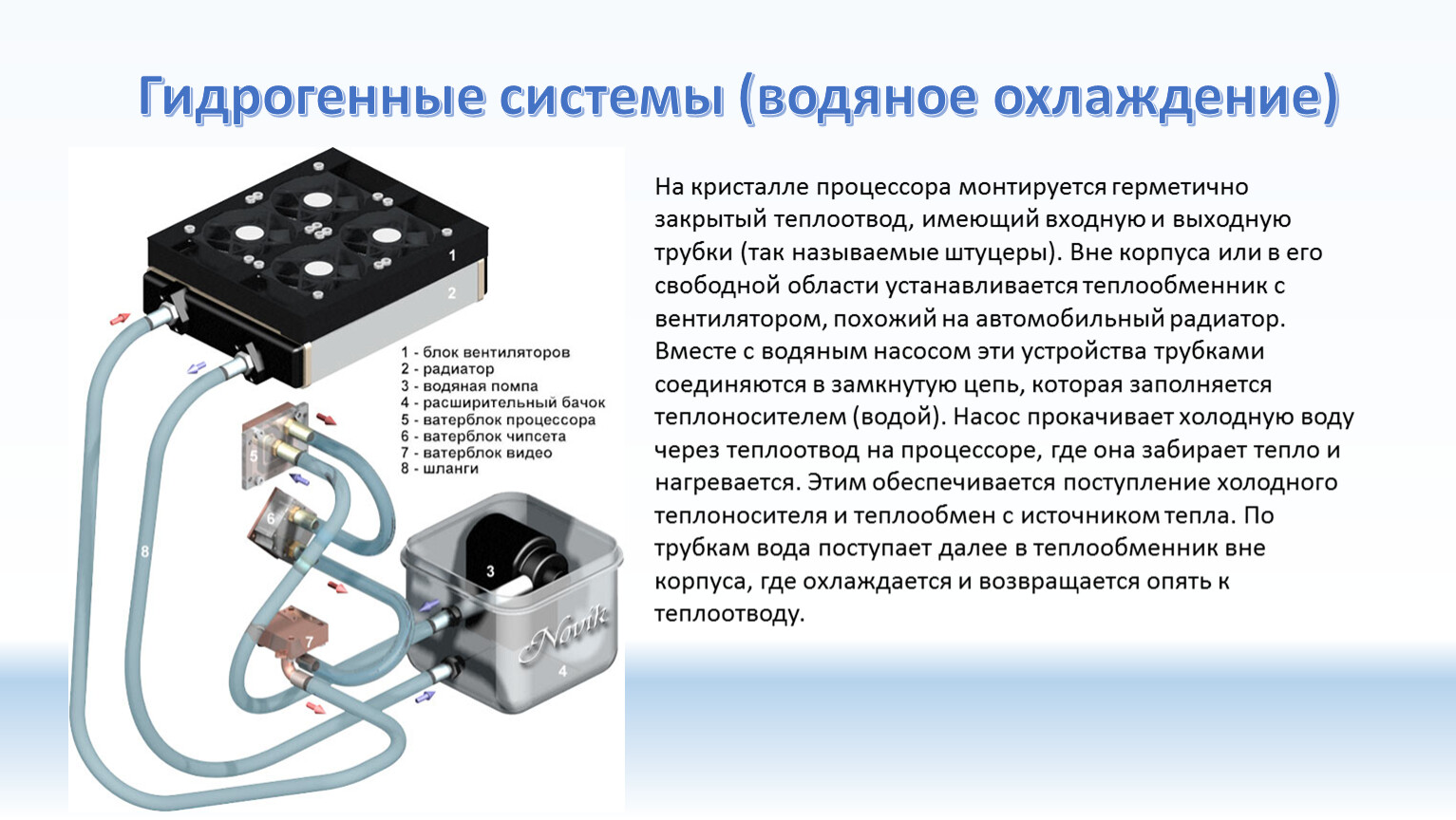 На кристалле процессора монтируется герметично закрытый теплоотвод, имеющий входную и выходную трубки (так называемые штуцеры). Вне корпуса или в его свободной области устанавливается теплообменник с вентилятором, похожий на автомобильный радиатор. Вместе с водяным насосом эти устройства трубками соединяются в замкнутую цепь, которая заполняется теплоносителем (водой). Насос прокачивает холодную воду через теплоотвод на процессоре, где она забирает тепло и нагревается. Этим обеспечивается поступление холодного теплоносителя и теплообмен с источником тепла. По трубкам вода поступает далее в теплообменник вне корпуса, где охлаждается и возвращается опять к теплоотводу.