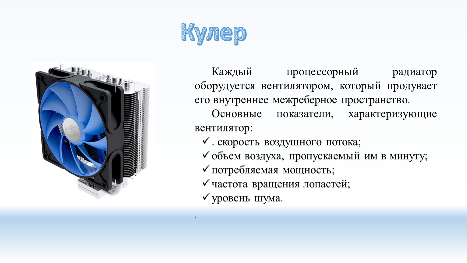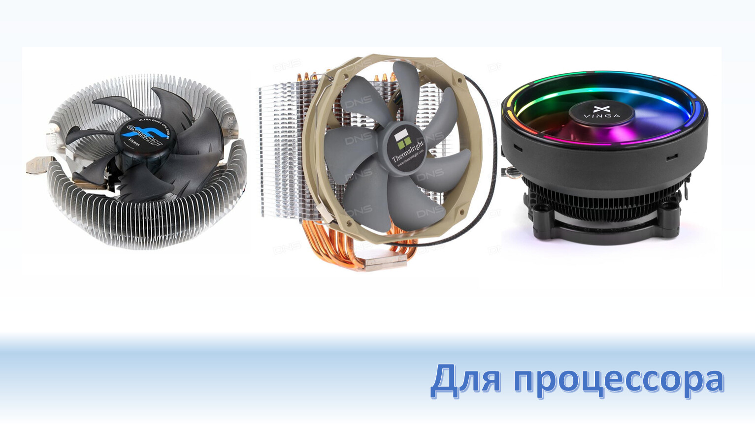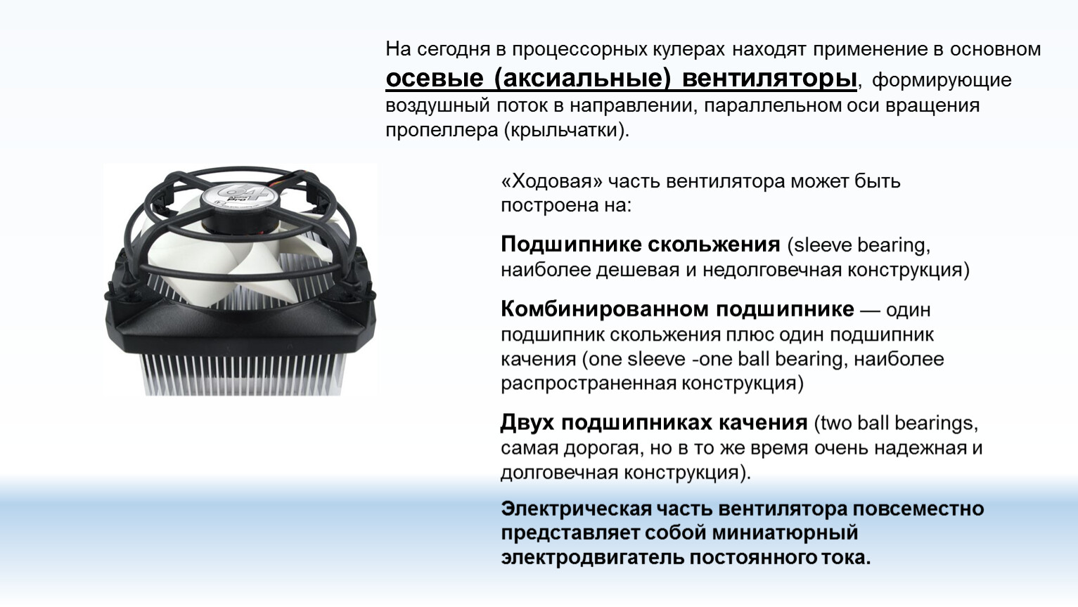 На сегодня в процессорных кулерах находят применение в основном осевые (аксиальные) вентиляторы, формирующие воздушный поток в направлении, параллельном оси вращения пропеллера (крыльчатки).