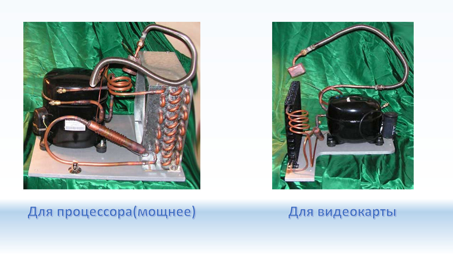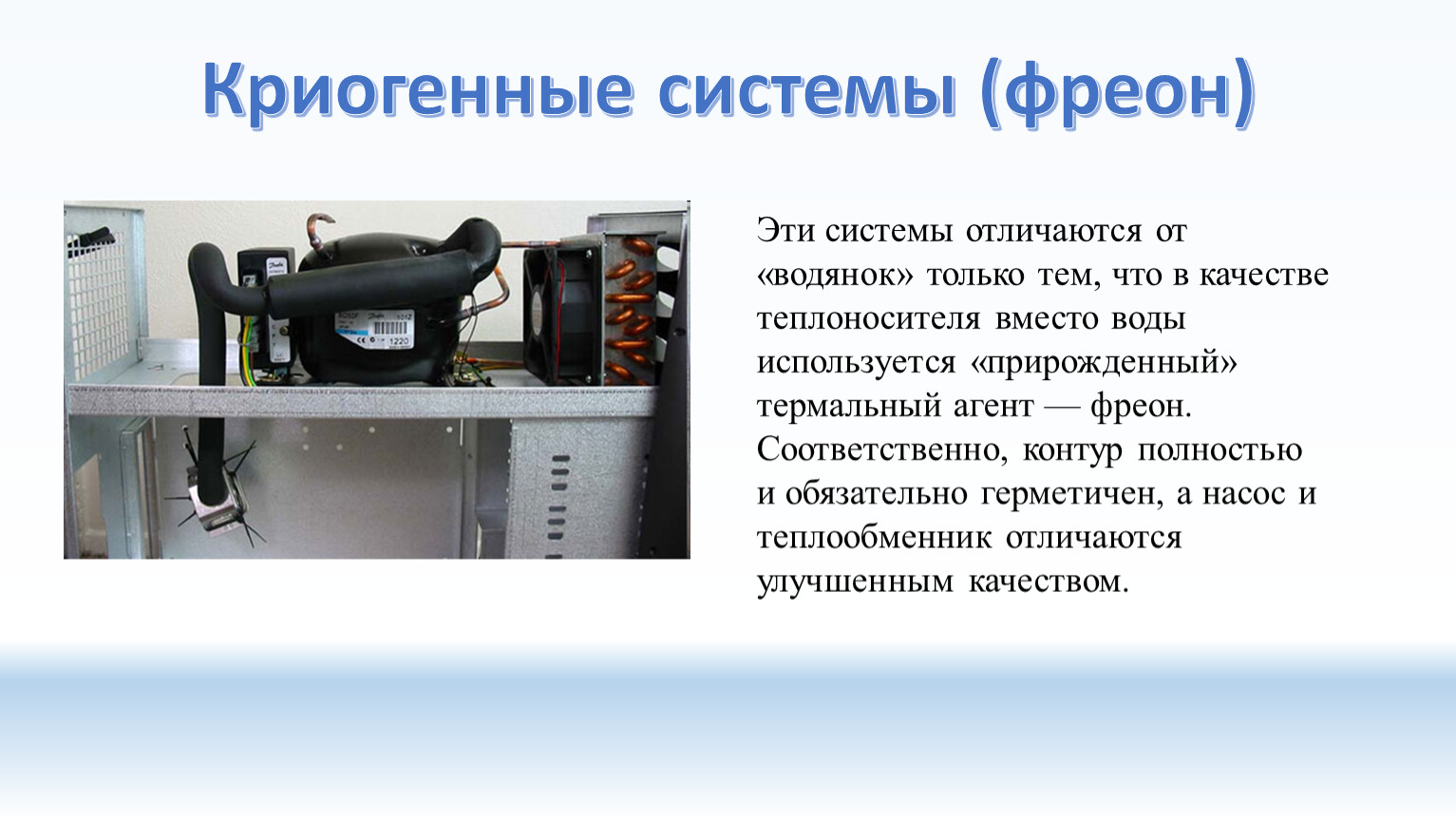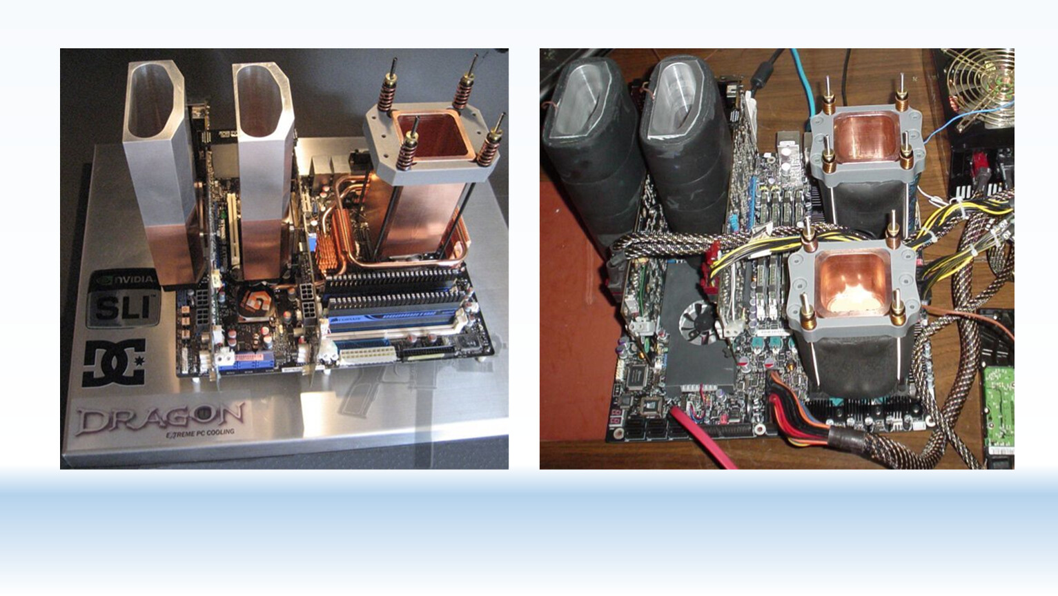 Эти системы отличаются от «водянок» только тем, что в качестве теплоносителя вместо воды используется «прирожденный» термальный агент — фреон. Соответственно, контур полностью и обязательно герметичен, а насос и теплообменник отличаются улучшенным качеством.