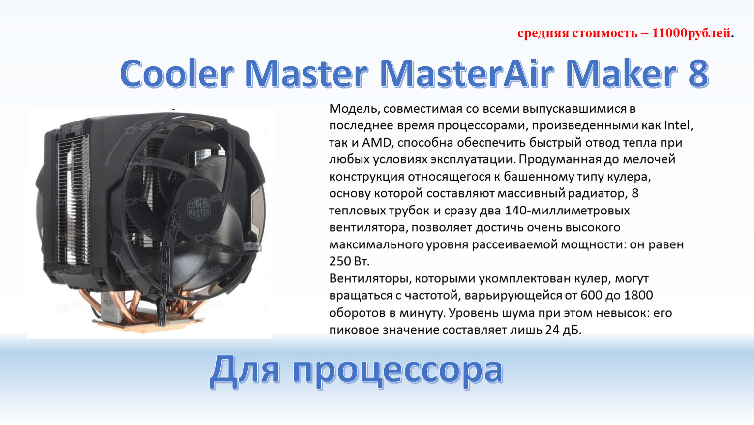 Модель, совместимая со всеми выпускавшимися в последнее время процессорами, произведенными как Intel, так и AMD, способна обеспечить быстрый отвод тепла при любых условиях эксплуатации. Продуманная до мелочей конструкция относящегося к башенному типу кулера, основу которой составляют массивный радиатор, 8 тепловых трубок и сразу два 140-миллиметровых вентилятора, позволяет достичь очень высокого максимального уровня рассеиваемой мощности: он равен 250 Вт.