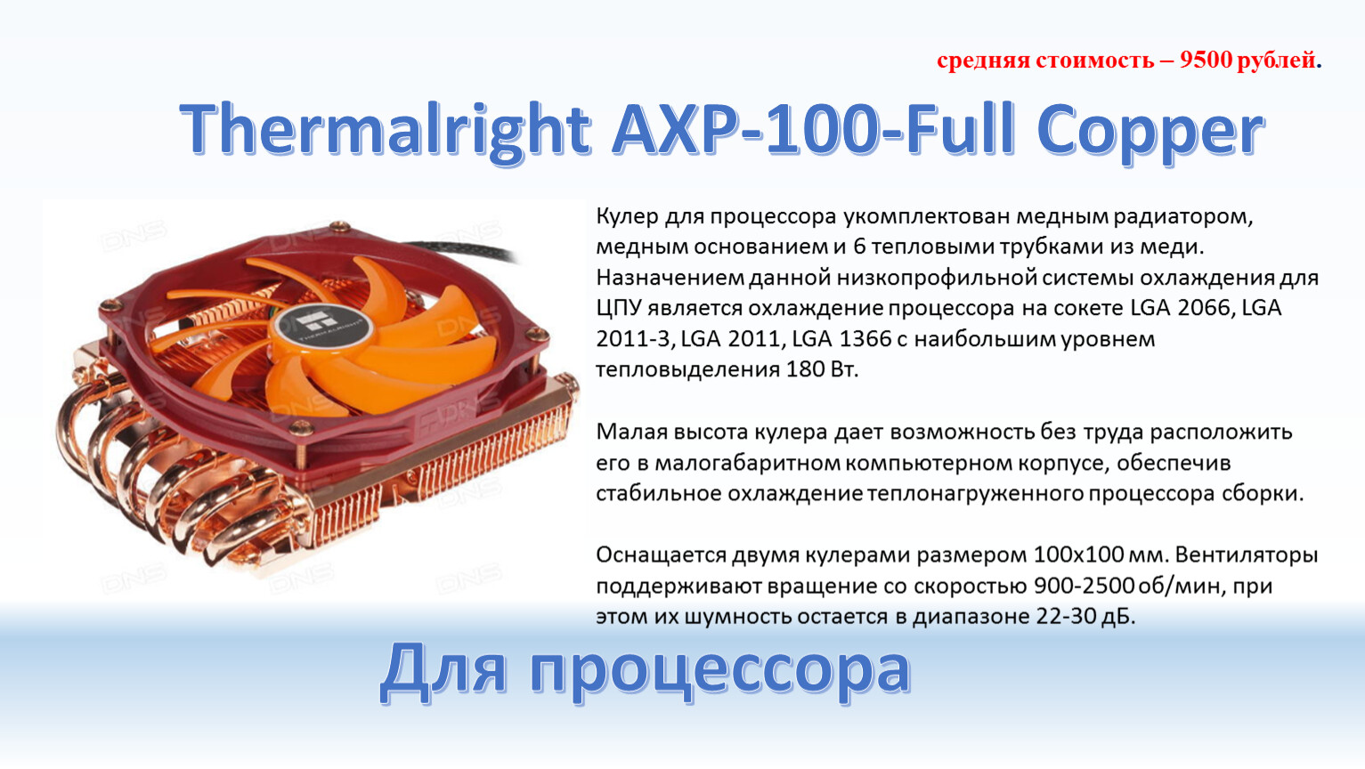 Назначением данной низкопрофильной системы охлаждения для ЦПУ является охлаждение процессора на сокете LGA 2066, LGA 2011-3, LGA 2011, LGA 1366 с наибольшим уровнем тепловыделения 180 Вт.