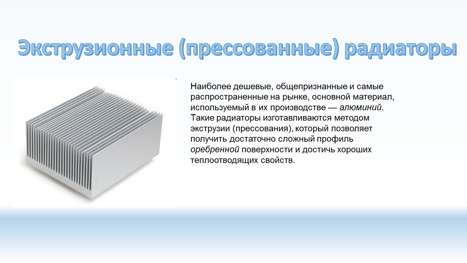 Наиболее дешевые, общепризнанные и самые распространенные на рынке, основной материал, используемый в их производстве — алюминий. Такие радиаторы изготавливаются методом экструзии (прессования), который позволяет получить достаточно сложный профиль оребренной поверхности и достичь хороших теплоотводящих свойств.