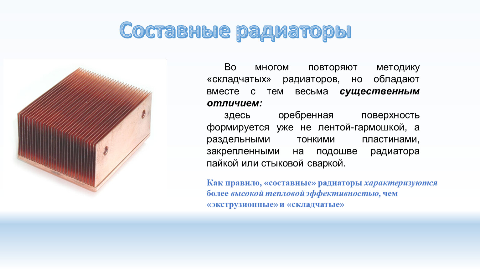 здесь оребренная поверхность формируется уже не лентой-гармошкой, а раздельными тонкими пластинами, закрепленными на подошве радиатора пайкой или стыковой сваркой.