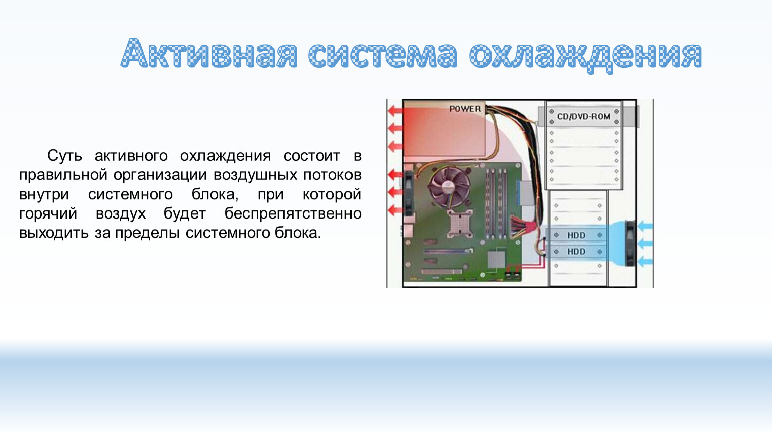 Суть активного охлаждения состоит в правильной организации воздушных потоков внутри системного блока, при которой горячий воздух будет беспрепятственно выходить за пределы системного блока.