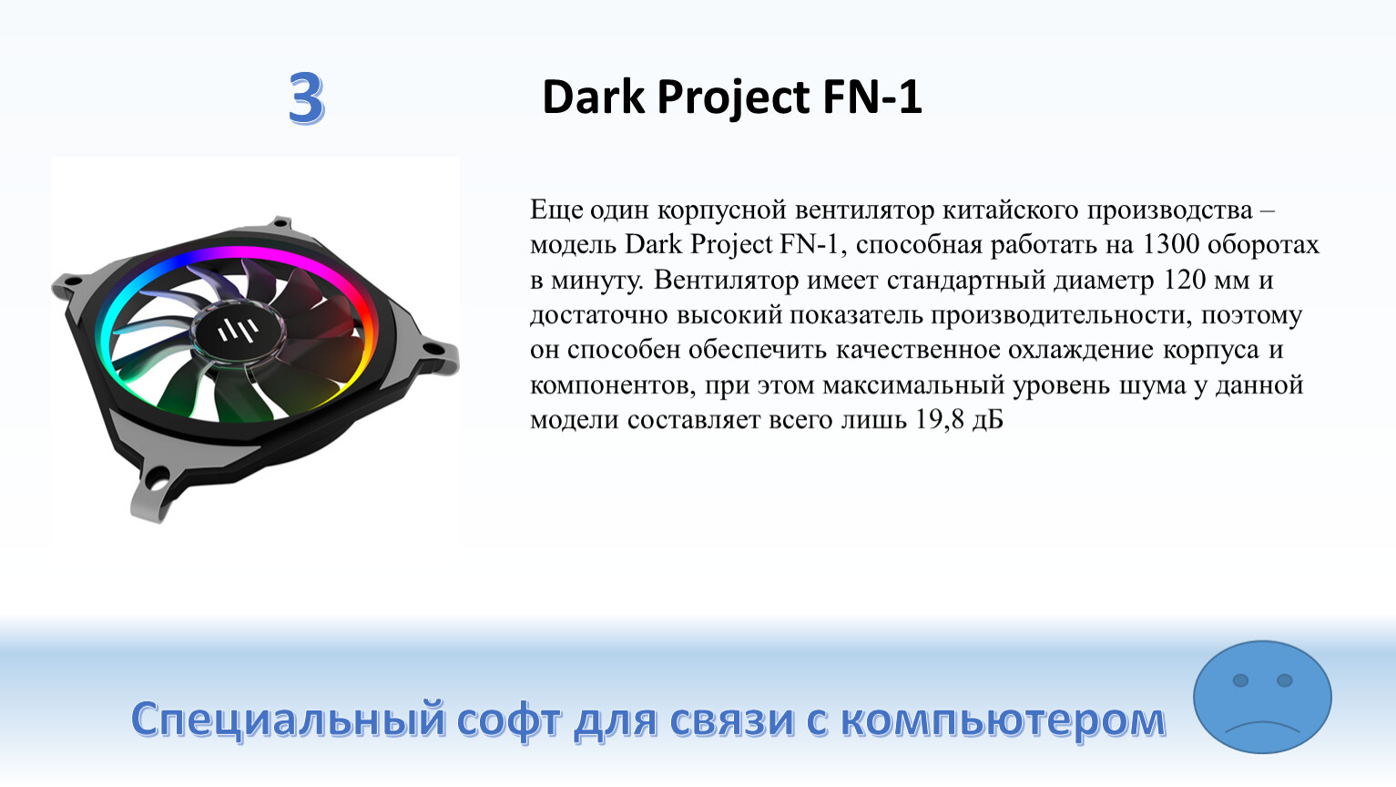 Еще один корпусной вентилятор китайского производства – модель Dark Project FN-1, способная работать на 1300 оборотах в минуту. Вентилятор имеет стандартный диаметр 120 мм и достаточно высокий показатель производительности, поэтому он способен обеспечить качественное охлаждение корпуса и компонентов, при этом максимальный уровень шума у данной модели составляет всего лишь 19,8 дБ