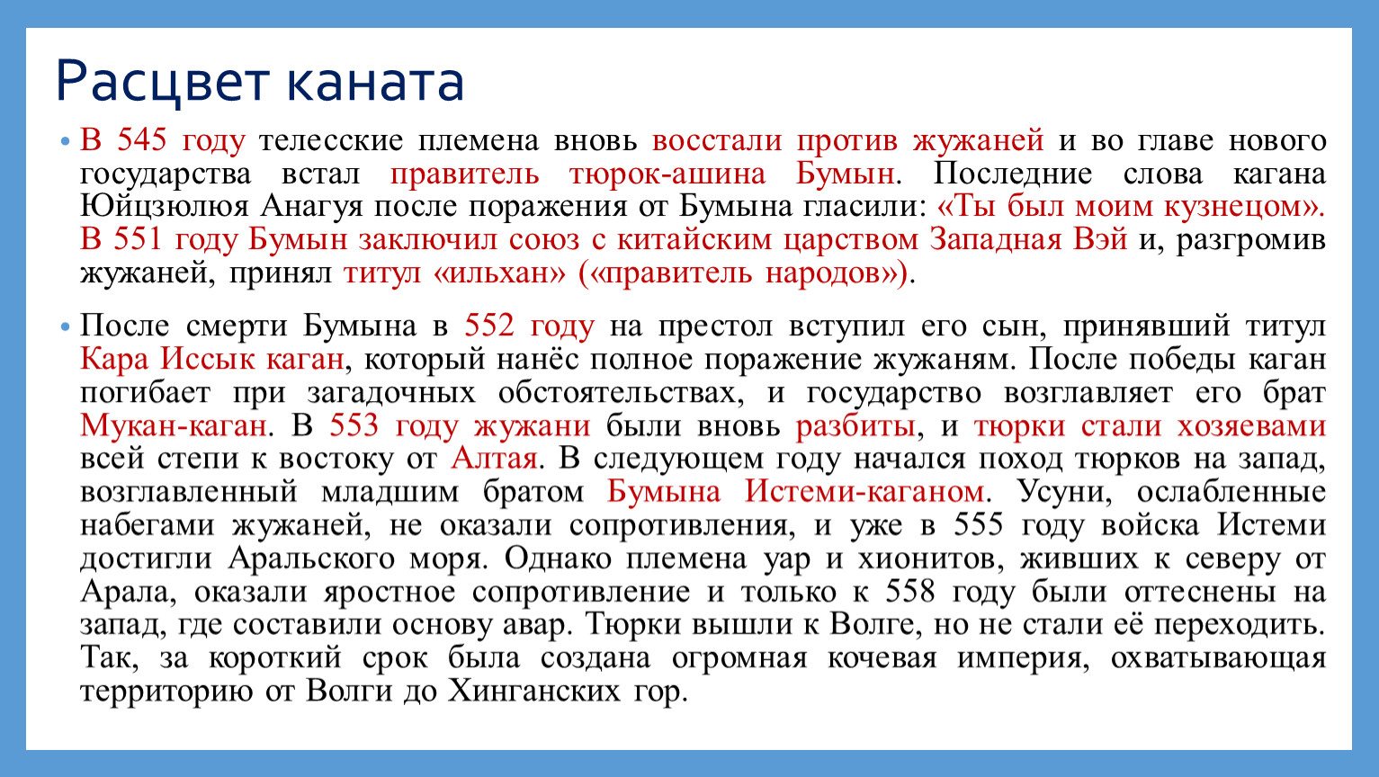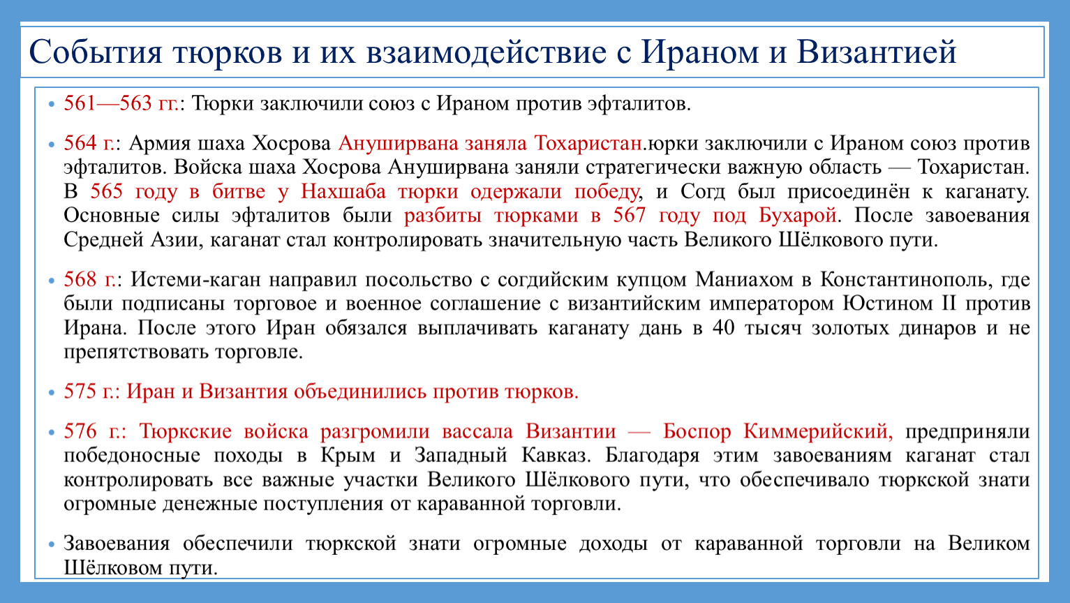 564 г.: Армия шаха Хосрова Ануширвана заняла Тохаристан.юрки заключили с Ираном союз против эфталитов. Войска шаха Хосрова Ануширвана заняли стратегически важную область — Тохаристан. В 565 году в битве у Нахшаба тюрки одержали победу, и Согд был присоединён к каганату. Основные силы эфталитов были разбиты тюрками в 567 году под Бухарой. После завоевания Средней Азии, каганат стал контролировать значительную часть Великого Шёлкового пути.