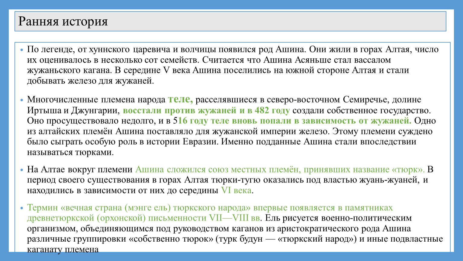 546 г.: Разгром племени теле (50 тысяч кибиток). Присоединение к тюркам.Они присоединились к тюркам, и те заметно усилились. Первое упоминание этнонима «тюрк» встречается в китайских летописях в 542 г. Китайцы считали тюрков потомками хунну (гунны или сюнну).
