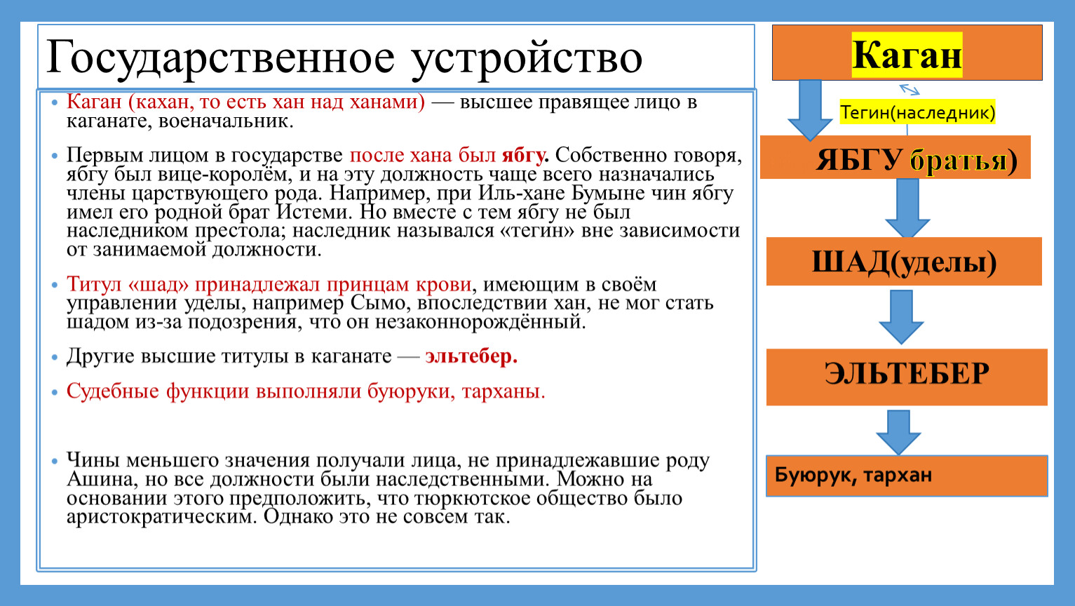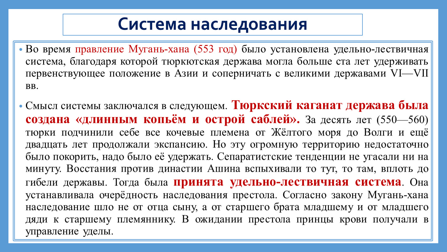 Во время правление Мугань-хана (553 год) было установлена удельно-лествичная система, благодаря которой тюркютская держава могла больше ста лет удерживать первенствующее положение в Азии и соперничать с великими державами VI—VII вв.