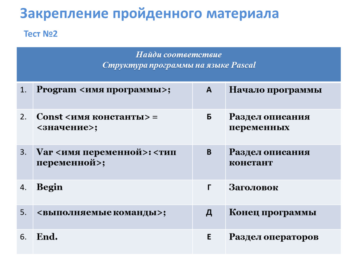Закрепление пройденного материала Тест №2