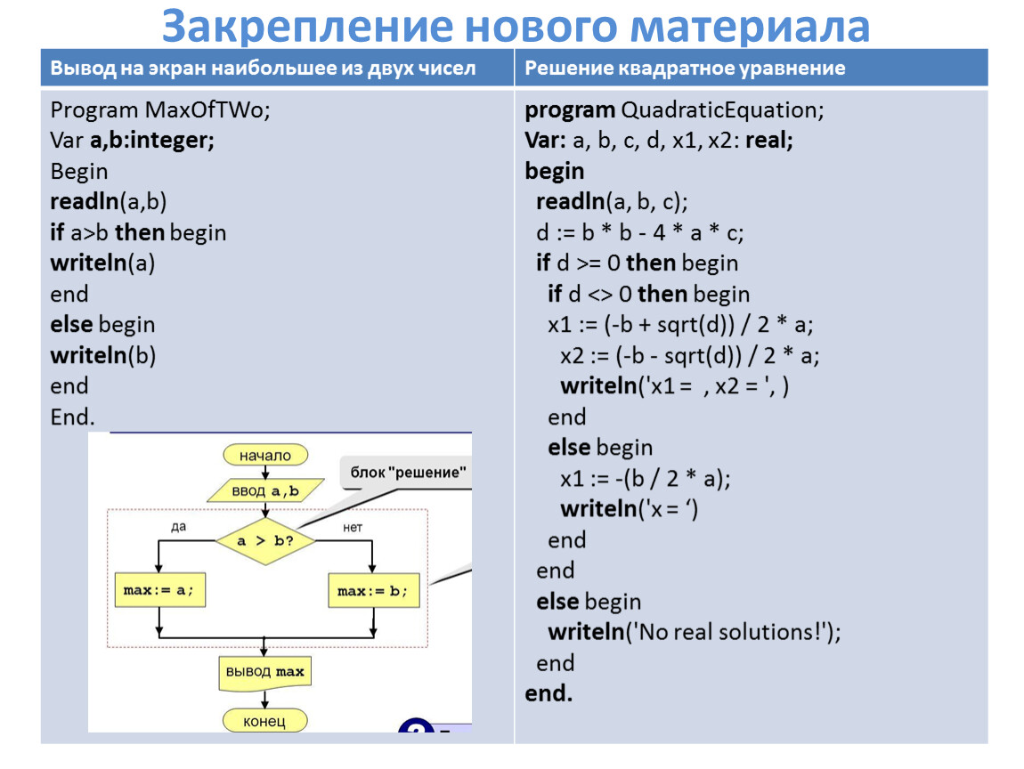 Вывод на экран наибольшее из двух чисел | Решение квадратное уравнение |