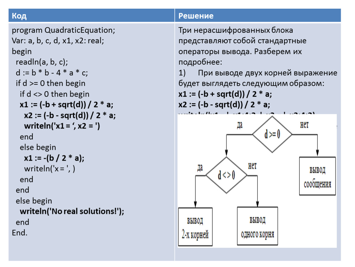program QuadraticEquation; | Три нерасшифрованных блока представляют собой стандартные операторы вывода. Разберем их подробнее: |