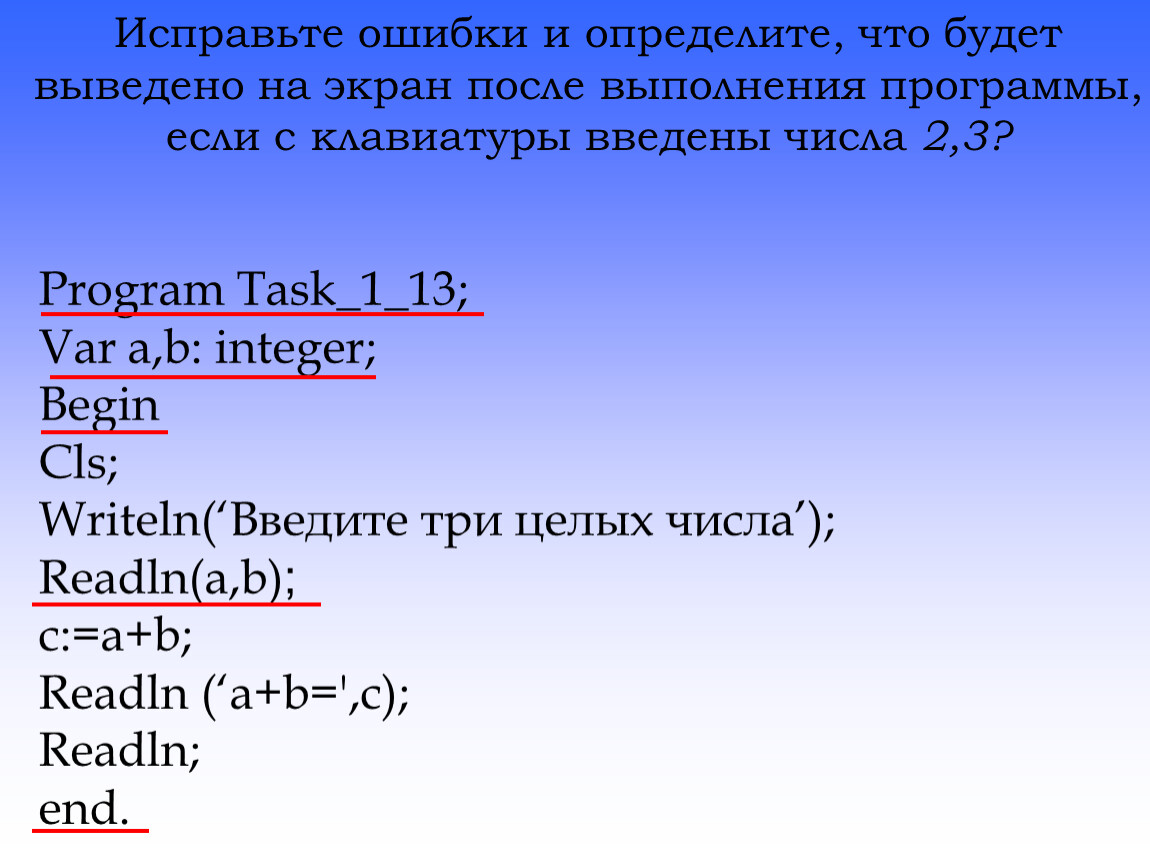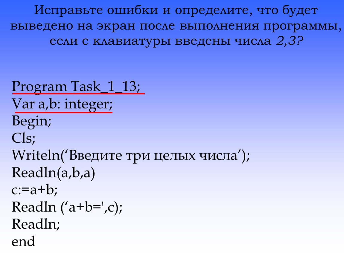 Исправьте ошибки и определите, что будет выведено на экран после выполнения программы, если с клавиатуры введены числа 2,3?