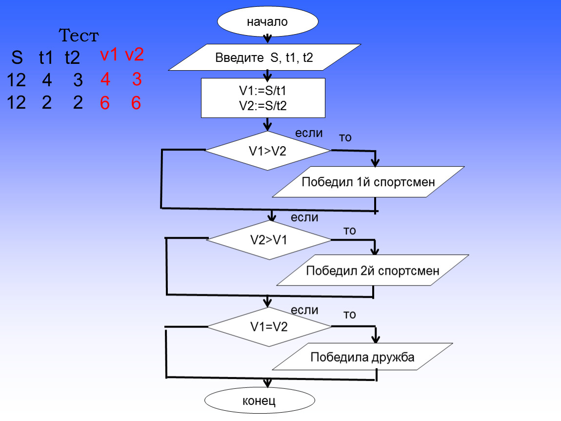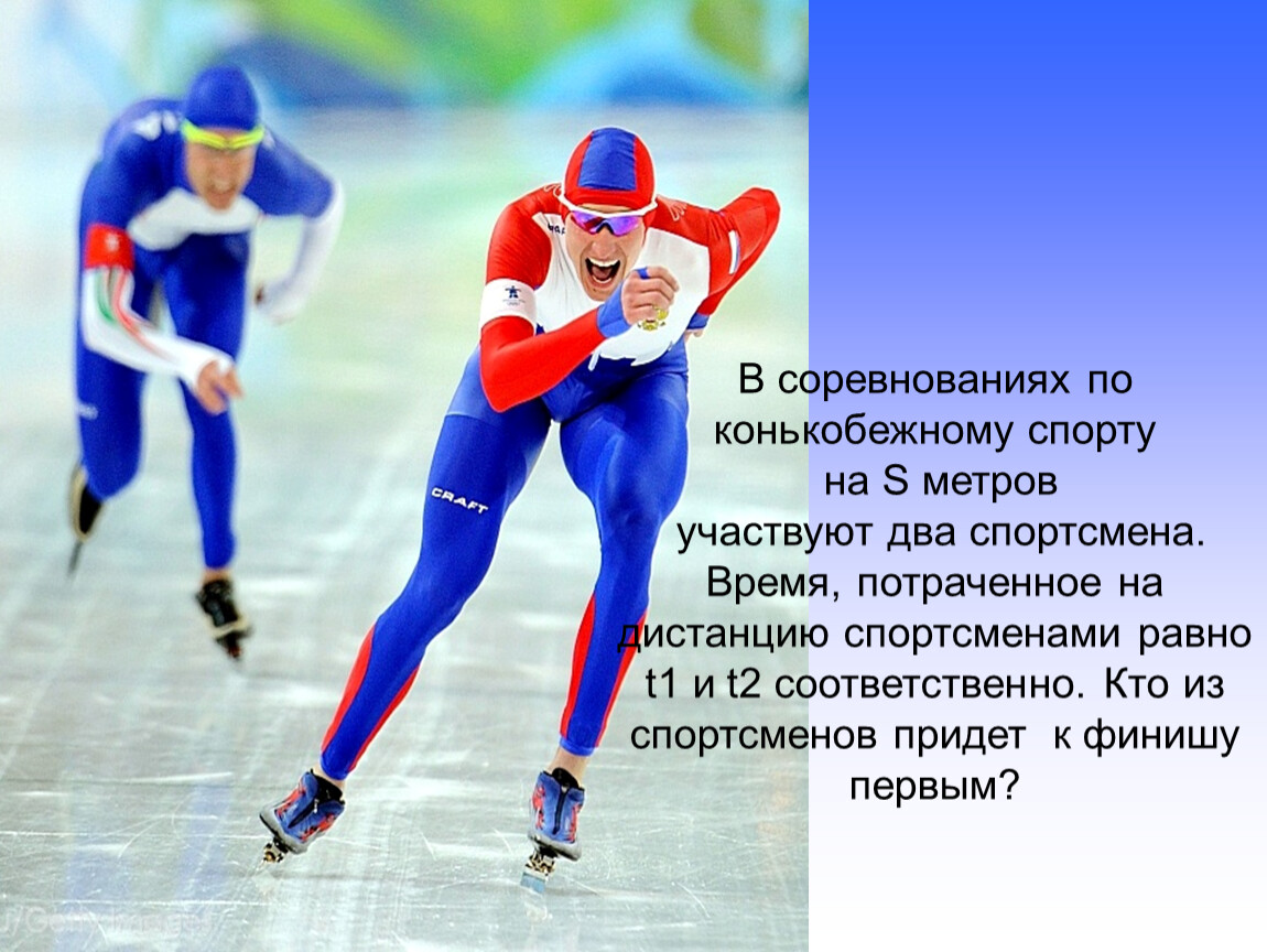 участвуют два спортсмена. Время, потраченное на дистанцию спортсменами равно t1 и t2 соответственно. Кто из спортсменов придет к финишу первым?