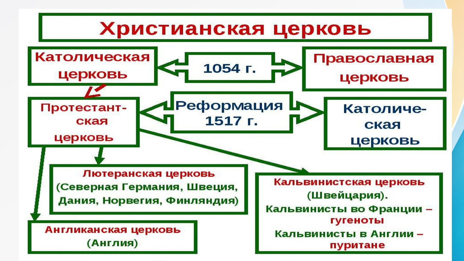 Протестантизм — одно из основных направлений в христианстве, возникшее в ходе Реформации. Объединяет множество самостоятельных течений: лютеранство, кальвинизм, англиканство, анабаптизм.