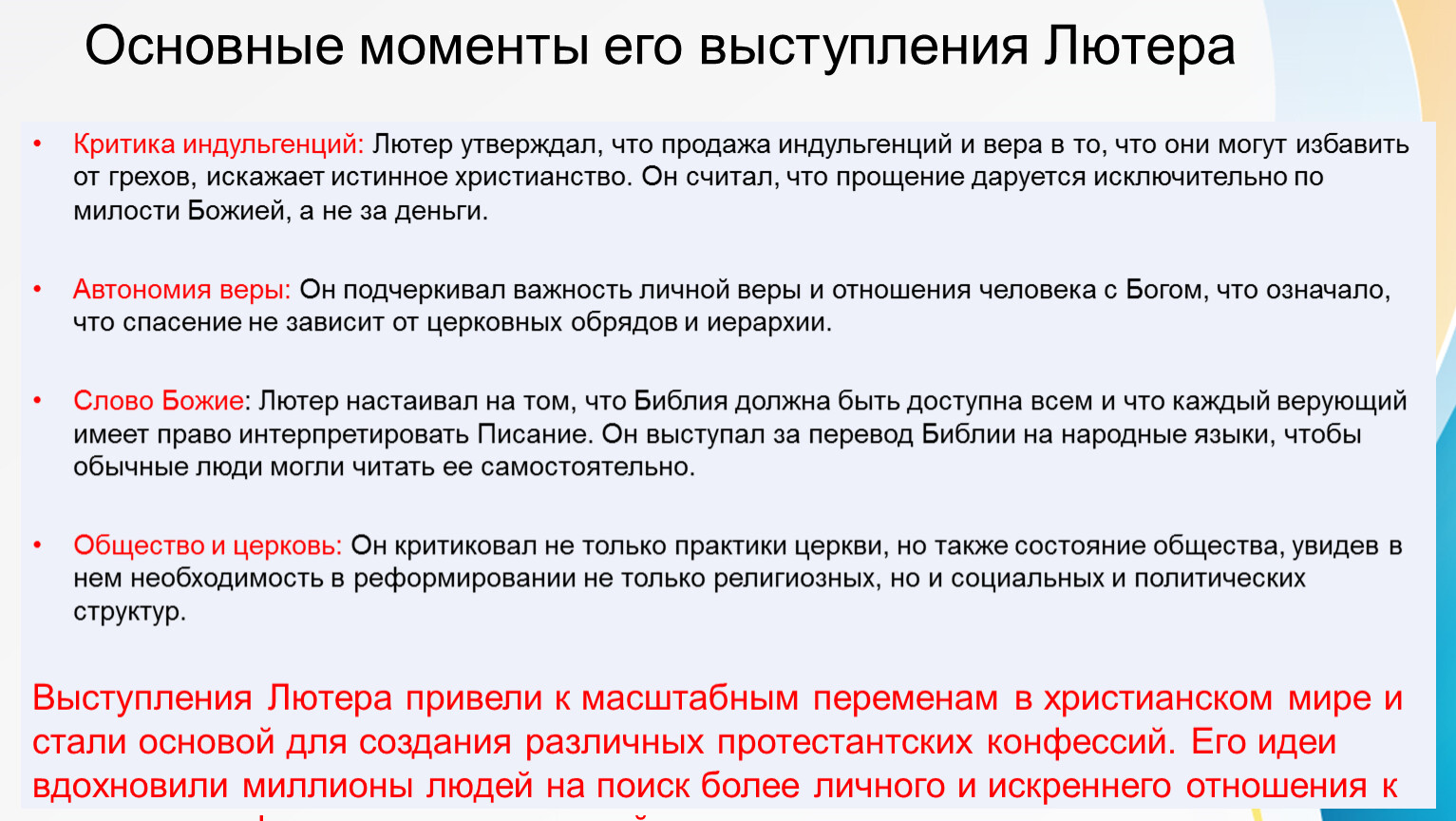Выступления Лютера привели к масштабным переменам в христианском мире и стали основой для создания различных протестантских конфессий. Его идеи вдохновили миллионы людей на поиск более личного и искреннего отношения к вере и трансформацию религиозной практики.