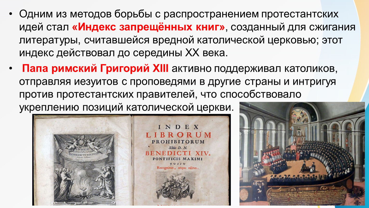 Одним из методов борьбы с распространением протестантских идей стал «Индекс запрещённых книг», созданный для сжигания литературы, считавшейся вредной католической церковью; этот индекс действовал до середины XX века.