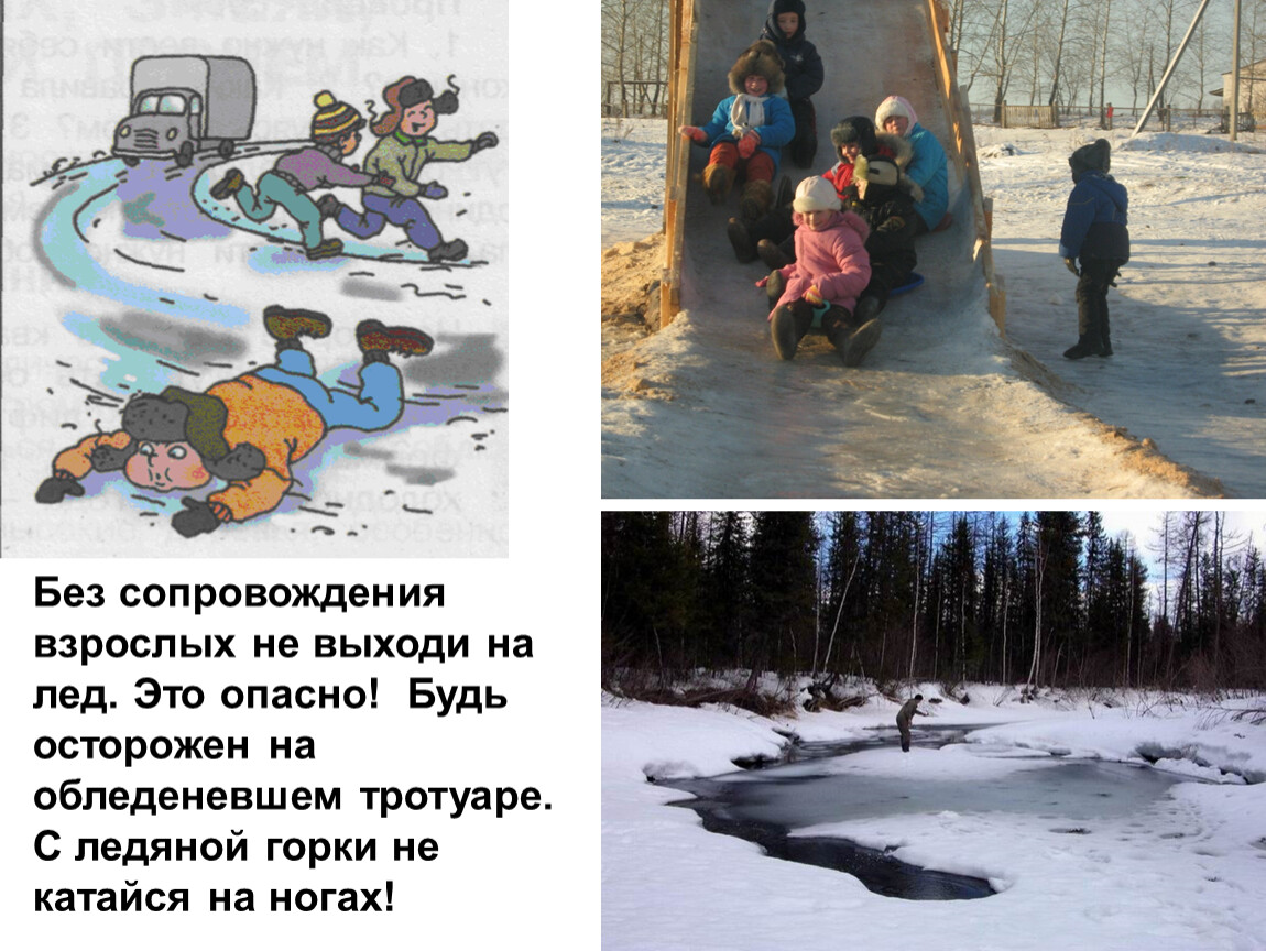 Без сопровождения взрослых не выходи на лед. Это опасно! Будь осторожен на обледеневшем тротуаре. С ледяной горки не катайся на ногах!