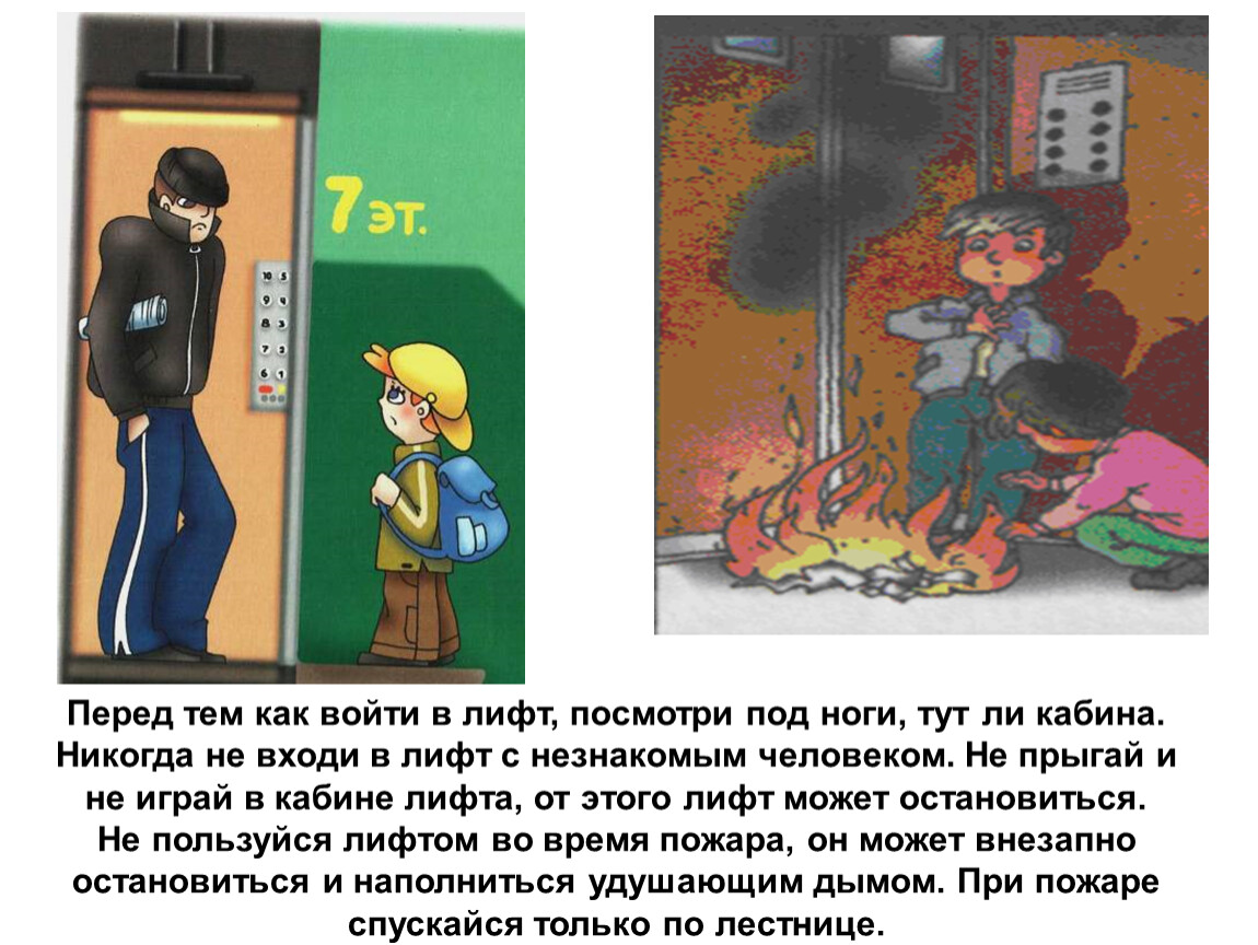 Никогда не входи в лифт с незнакомым человеком. Не прыгай и не играй в кабине лифта, от этого лифт может остановиться.