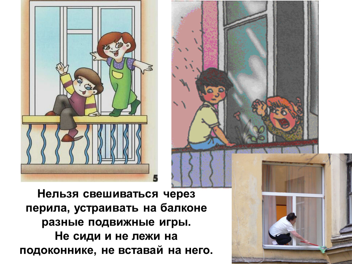 Нельзя свешиваться через перила, устраивать на балконе разные подвижные игры.
