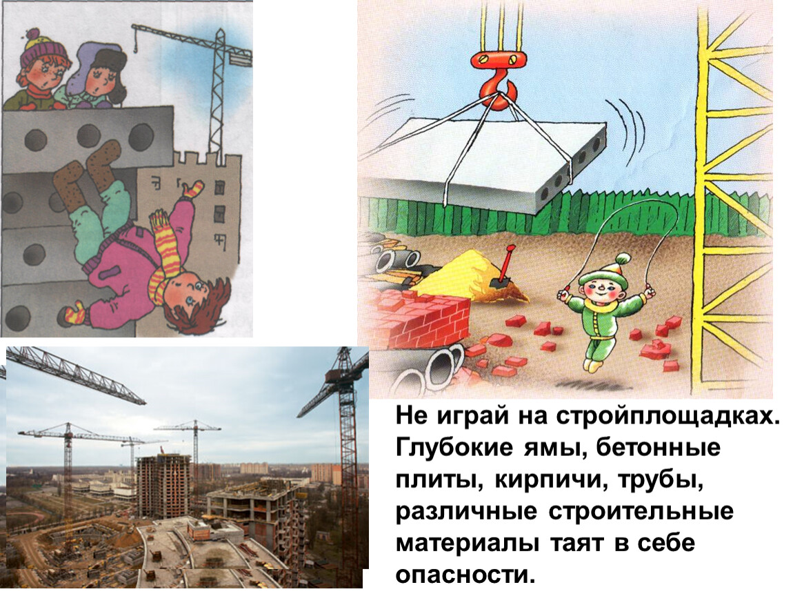 Не играй на стройплощадках. Глубокие ямы, бетонные плиты, кирпичи, трубы, различные строительные материалы таят в себе опасности.