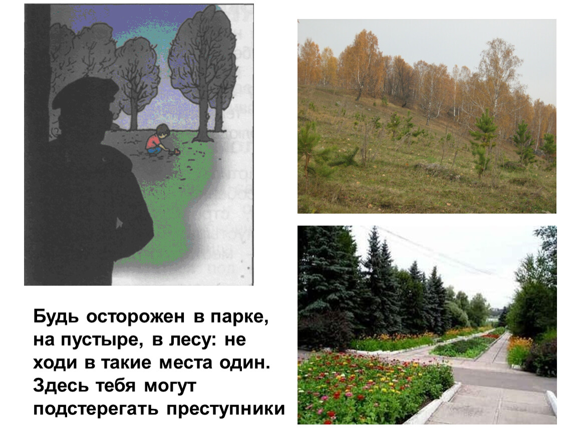 Будь осторожен в парке, на пустыре, в лесу: не ходи в такие места один. Здесь тебя могут подстерегать преступники