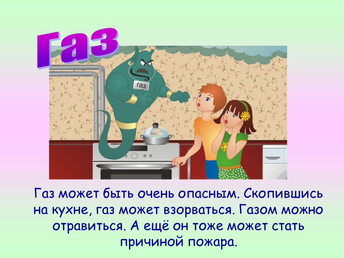 Газ может быть очень опасным. Скопившись на кухне, газ может взорваться. Газом можно отравиться. А ещё он тоже может стать причиной пожара.