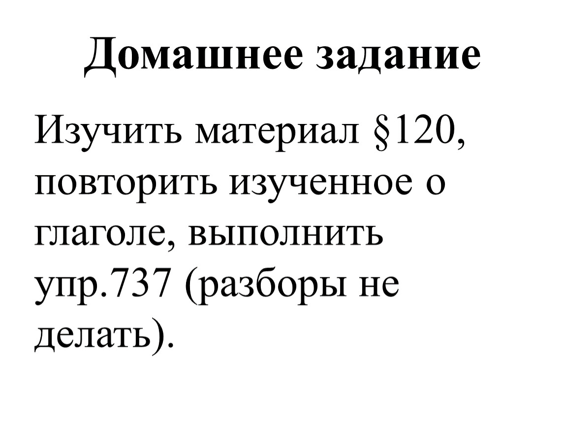 Изучить материал §120, повторить изученное о глаголе, выполнить упр.737 (разборы не делать).