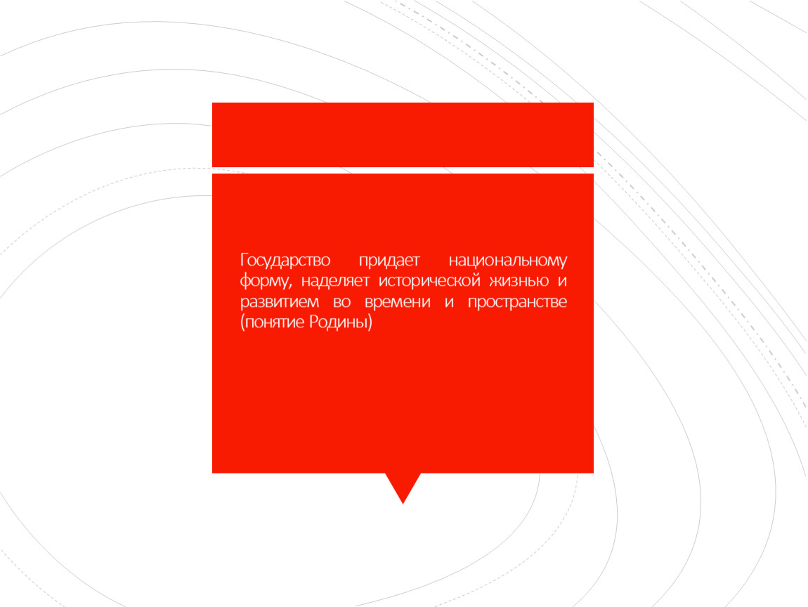 Государство придает национальному форму, наделяет исторической жизнью и развитием во времени и пространстве (понятие Родины)