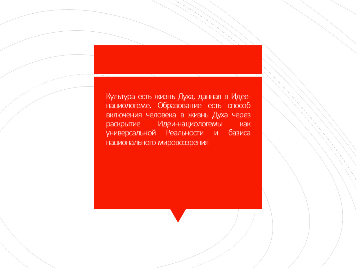 Культура есть жизнь Духа, данная в Идее-нациологеме. Образование есть способ включения человека в жизнь Духа через раскрытие Идеи-нациологемы как универсальной Реальности и базиса национального мировоззрения