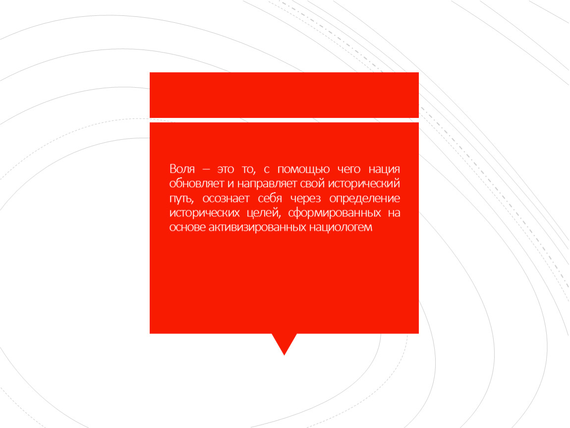 Воля – это то, с помощью чего нация обновляет и направляет свой исторический путь, осознает себя через определение исторических целей, сформированных на основе активизированных нациологем