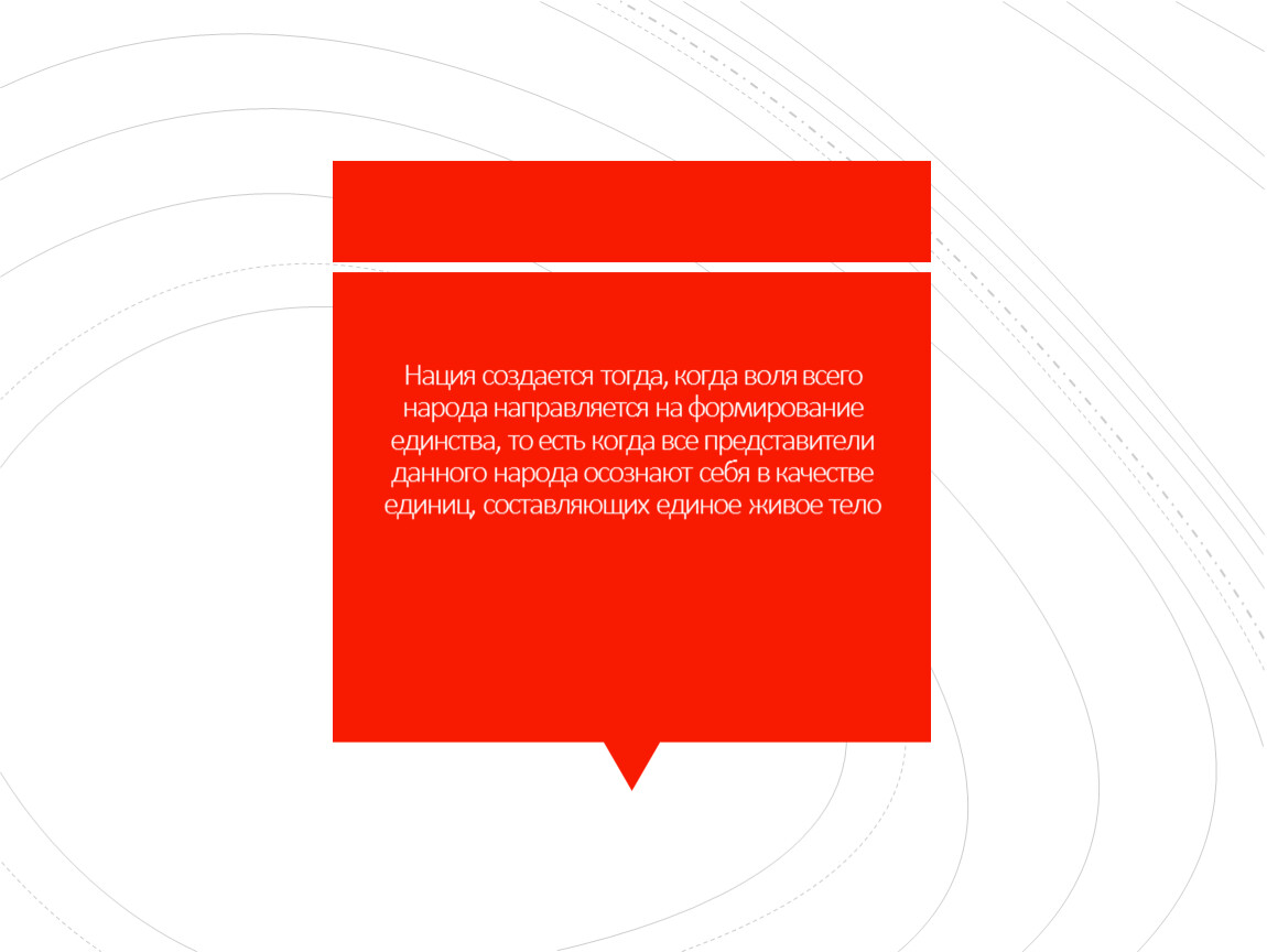 Нация создается тогда, когда воля всего народа направляется на формирование единства, то есть когда все представители данного народа осознают себя в качестве единиц, составляющих единое живое тело