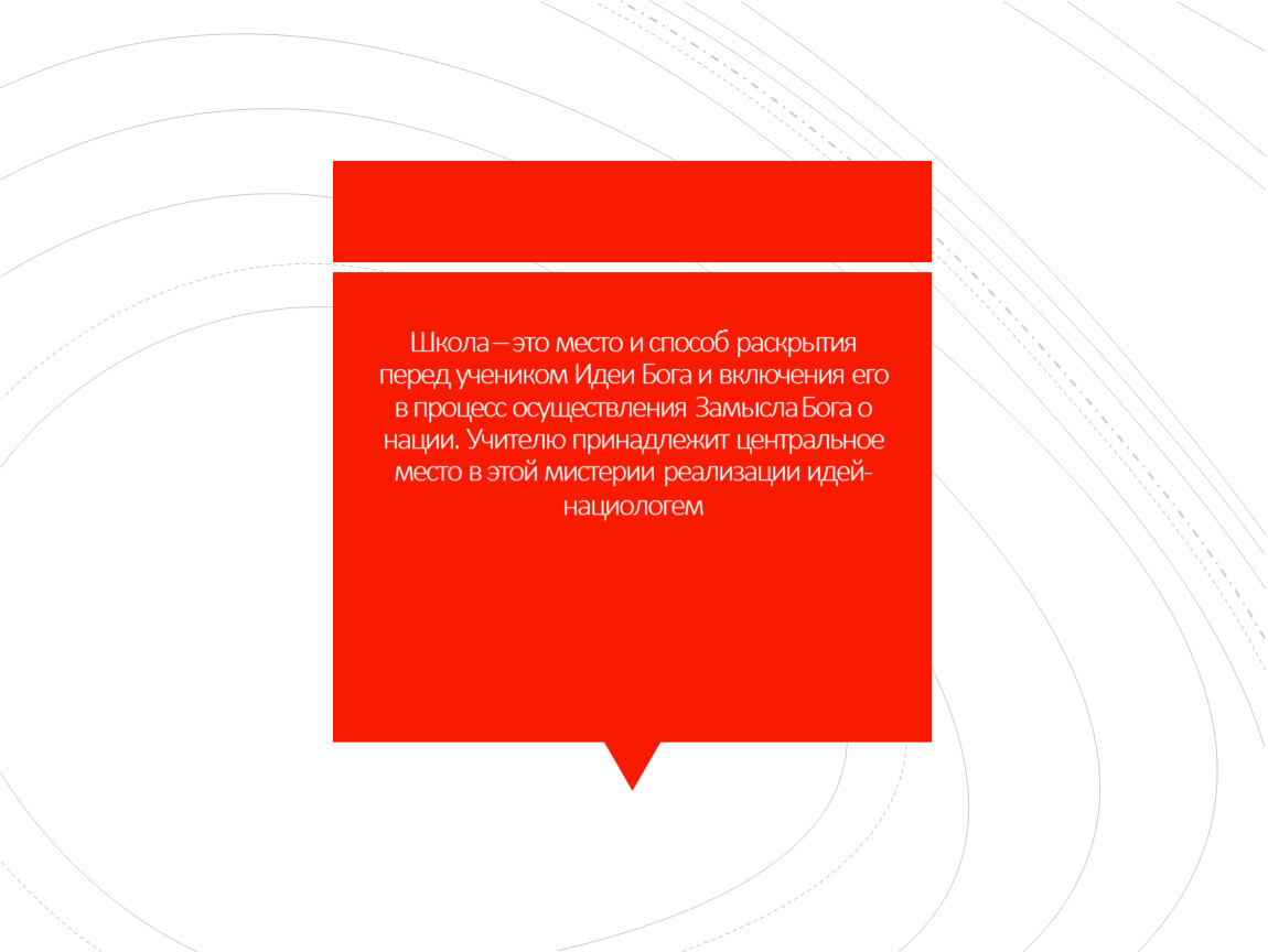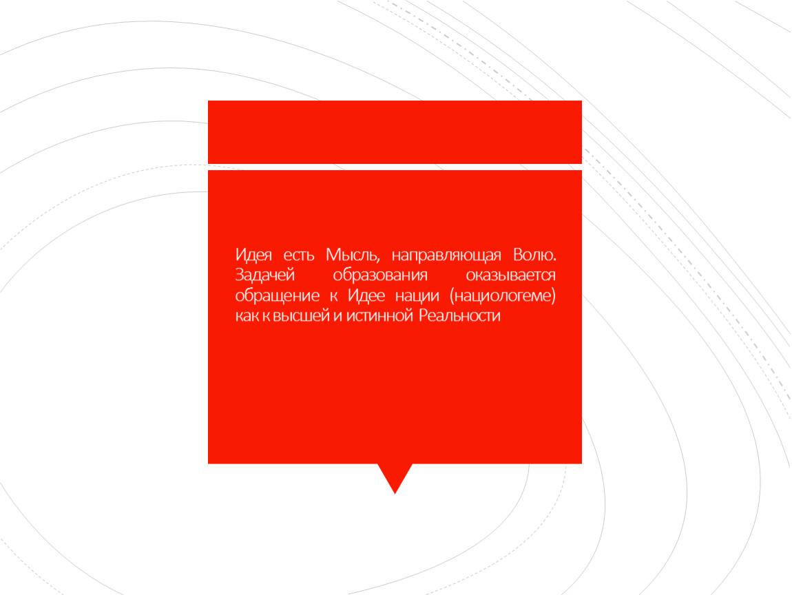 Идея есть Мысль, направляющая Волю. Задачей образования оказывается обращение к Идее нации (нациологеме) как к высшей и истинной Реальности