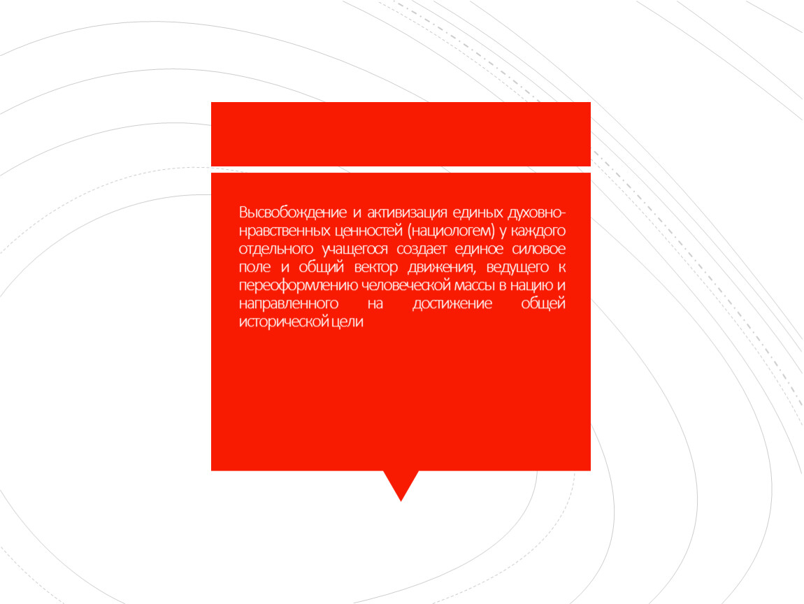 Высвобождение и активизация единых духовно-нравственных ценностей (нациологем) у каждого отдельного учащегося создает единое силовое поле и общий вектор движения, ведущего к переоформлению человеческой массы в нацию и направленного на достижение общей исторической цели