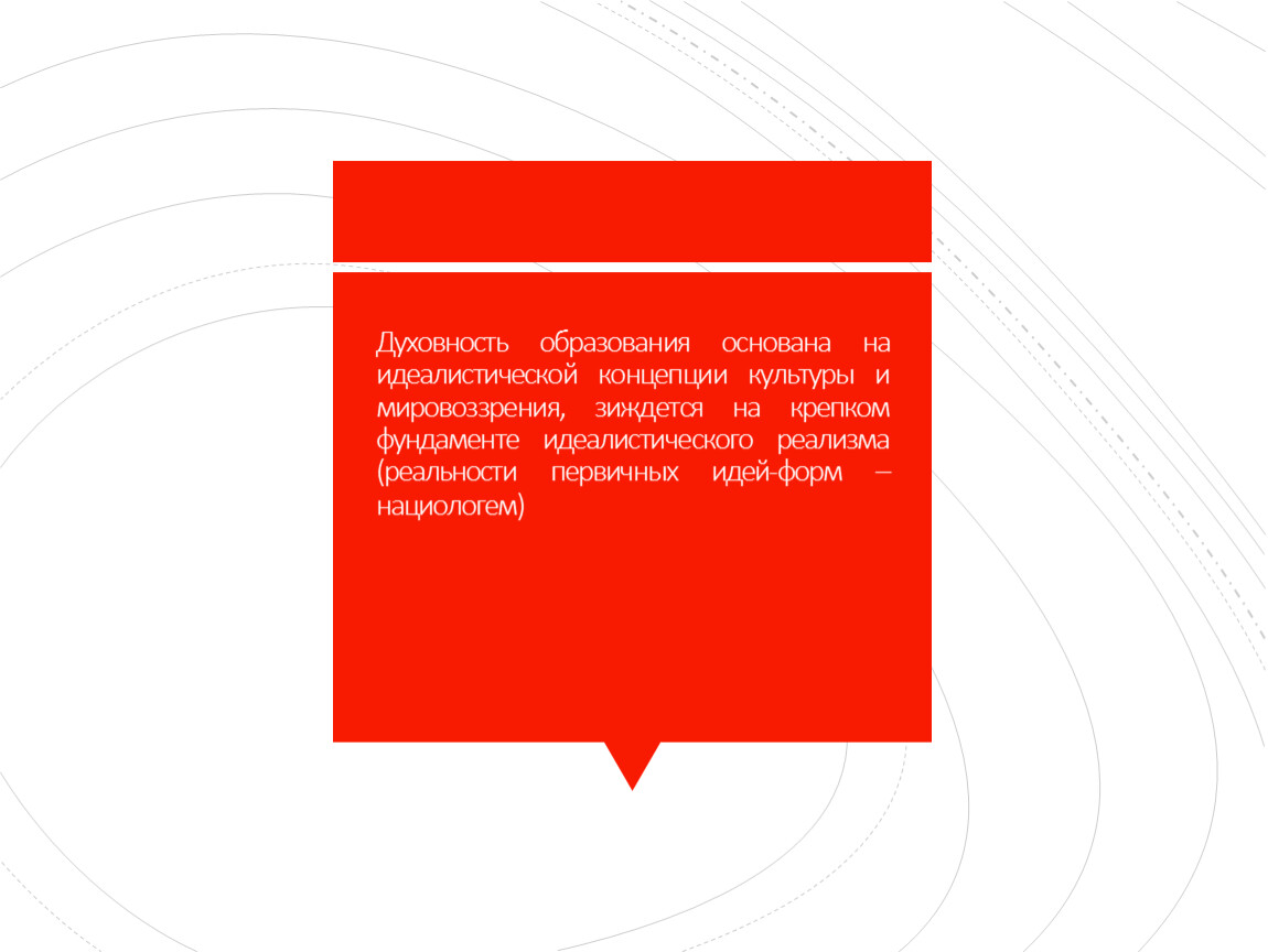 Духовность образования основана на идеалистической концепции культуры и мировоззрения, зиждется на крепком фундаменте идеалистического реализма (реальности первичных идей-форм – нациологем)