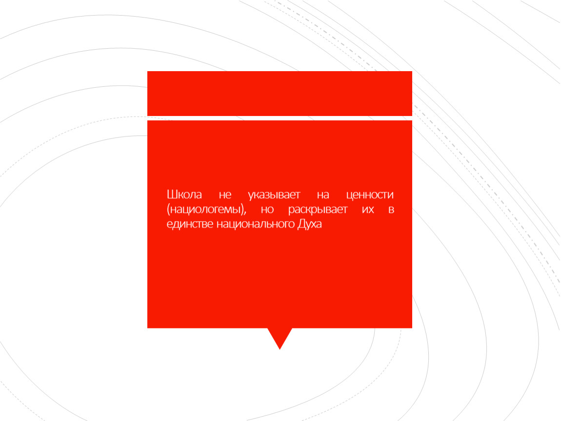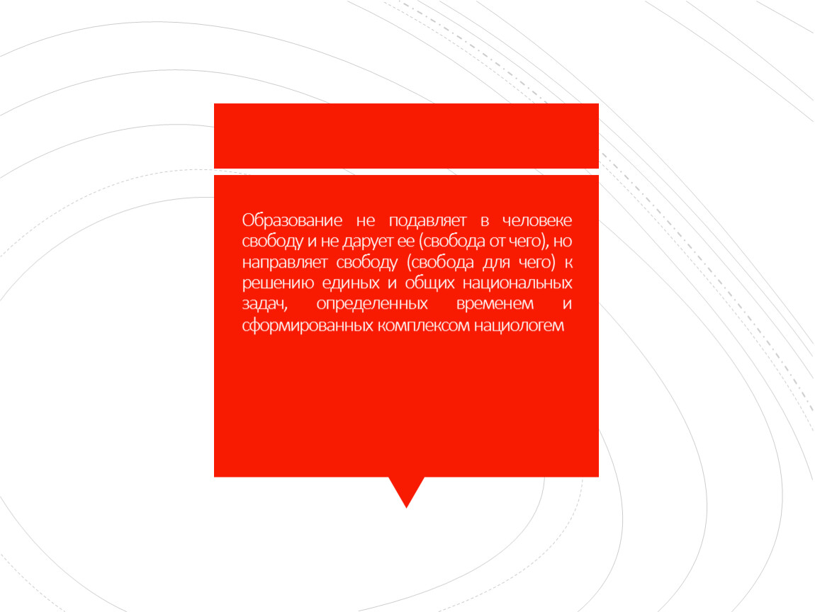 Образование не подавляет в человеке свободу и не дарует ее (свобода от чего), но направляет свободу (свобода для чего) к решению единых и общих национальных задач, определенных временем и сформированных комплексом нациологем