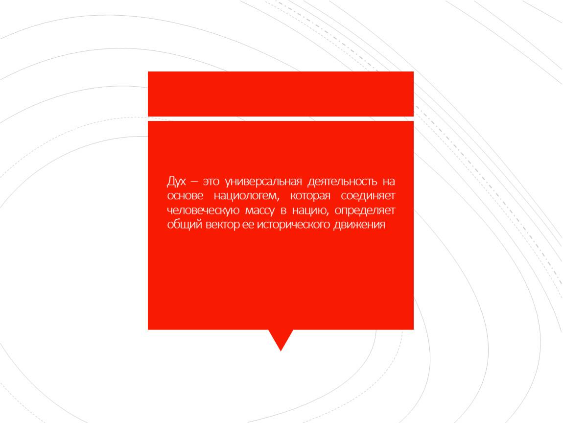 Дух – это универсальная деятельность на основе нациологем, которая соединяет человеческую массу в нацию, определяет общий вектор ее исторического движения