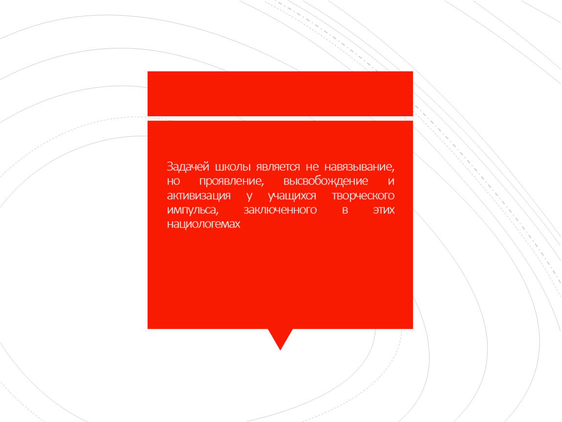 Задачей школы является не навязывание, но проявление, высвобождение и активизация у учащихся творческого импульса, заключенного в этих нациологемах