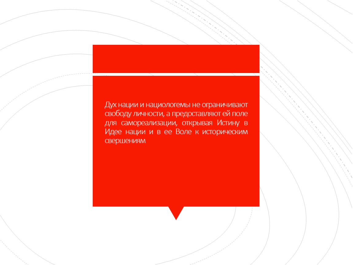 Дух нации и нациологемы не ограничивают свободу личности, а предоставляют ей поле для самореализации, открывая Истину в Идее нации и в ее Воле к историческим свершениям
