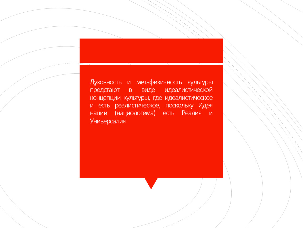Духовность и метафизичность культуры предстают в виде идеалистической концепции культуры, где идеалистическое и есть реалистическое, поскольку Идея нации (нациологема) есть Реалия и Универсалия