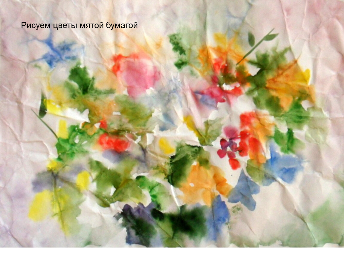 Рисование мятой бумагой. Вместо кисти попробуйте использовать комок смятой бумаги. У каждого комка есть свой рельеф, поэтому при желании можно получить интересную картину. Попробуйте нарисовать так сирень, одуванчики, облака.
